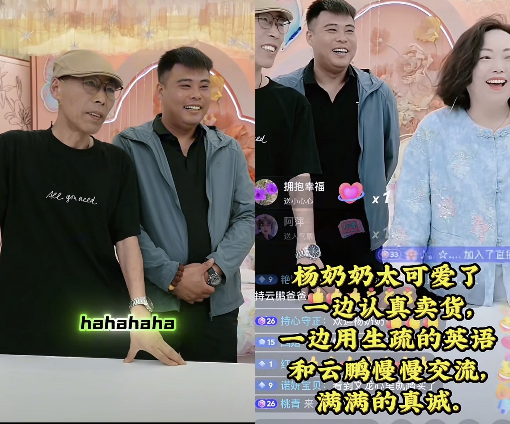 而且这次有云鹏堂哥助阵,云鹏爸爸也更有信心了,杨奶奶也是一如既往的给力,在直播间她用生疏的英语和张云鹏交流,很多网友被她蹩脚的英语逗得哈哈大笑