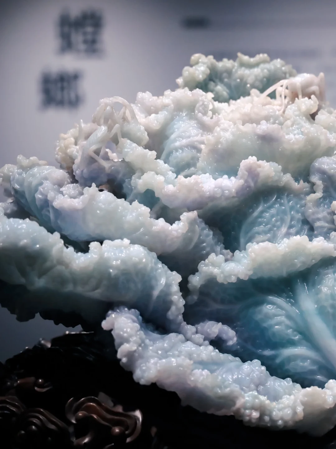 3)由江春源大师设计、时庆梅大师制作的《螳螂白菜》,是非遗珍宝馆的镇馆之宝,这个超级有意思的,有个大的,还有个小的,真的绝了,雕刻的栩栩如生,螳螂的细节全部都能看得一清二楚;