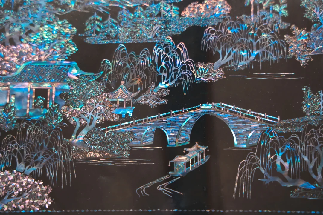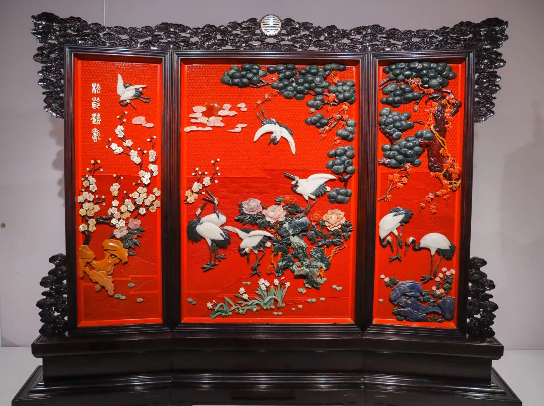 6)扬州漆器厂为1959年国庆十周年献礼的作品——玉雕漆嵌大挂屏《和平颂》《喜鹊登梅》。