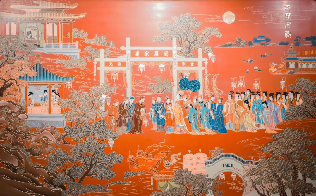 5)张宇大师设计的红雕漆地屏《岱宗览胜》;