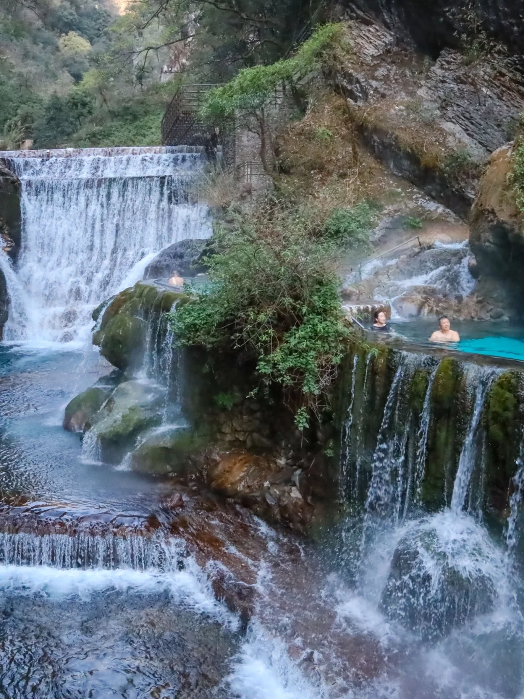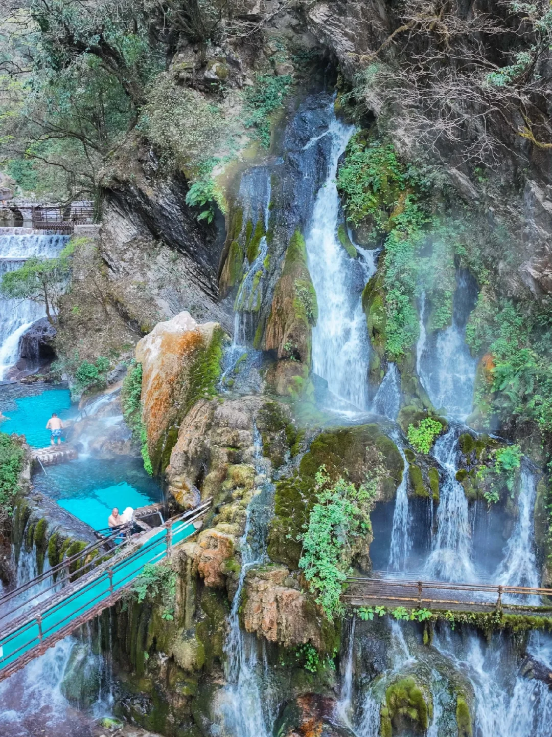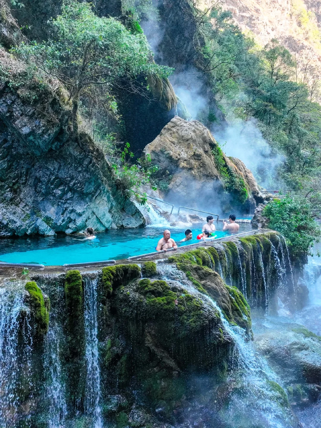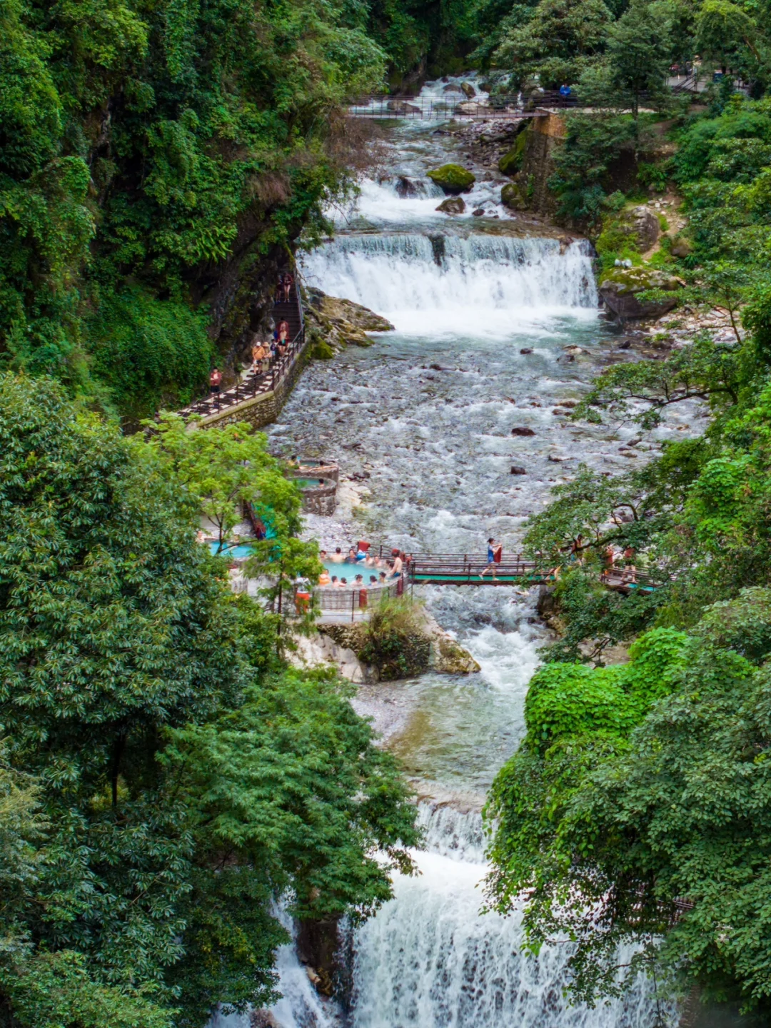 🏞️进入温泉区后,你会发现这里的环境十分优美。众多个小瀑布从高处落下,共同组成了瑰丽的瀑布群,是四川第一大瀑布群,高达100多米的落差,分布着各色形态的小瀑布,有大珠小珠落玉盘,有疑是银河落九天,有水雾腾空飘不定,有今古长如白练飞。