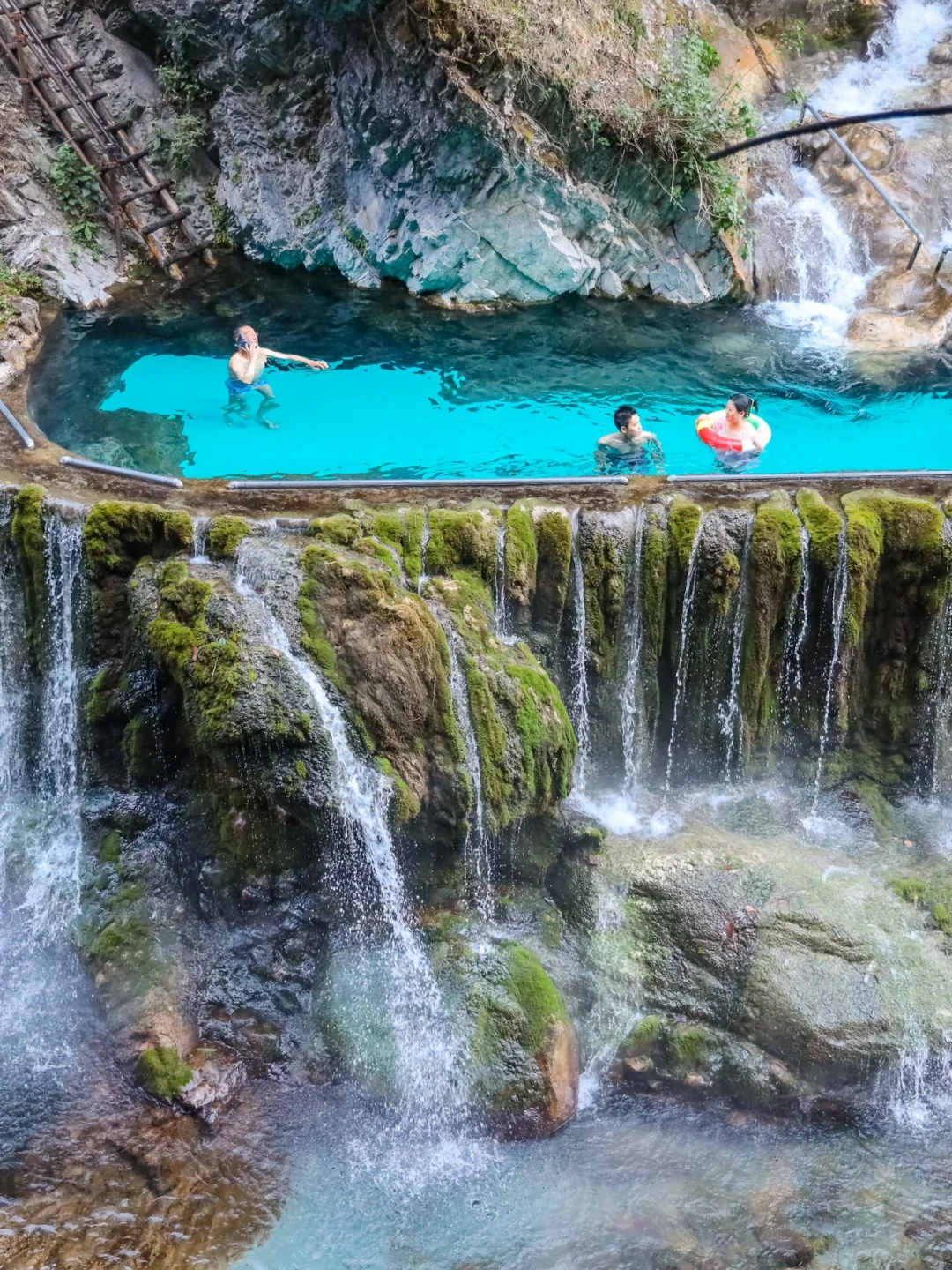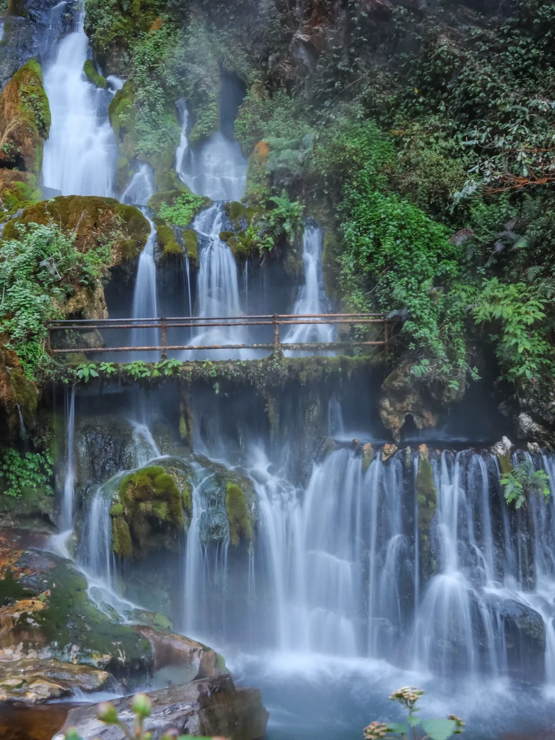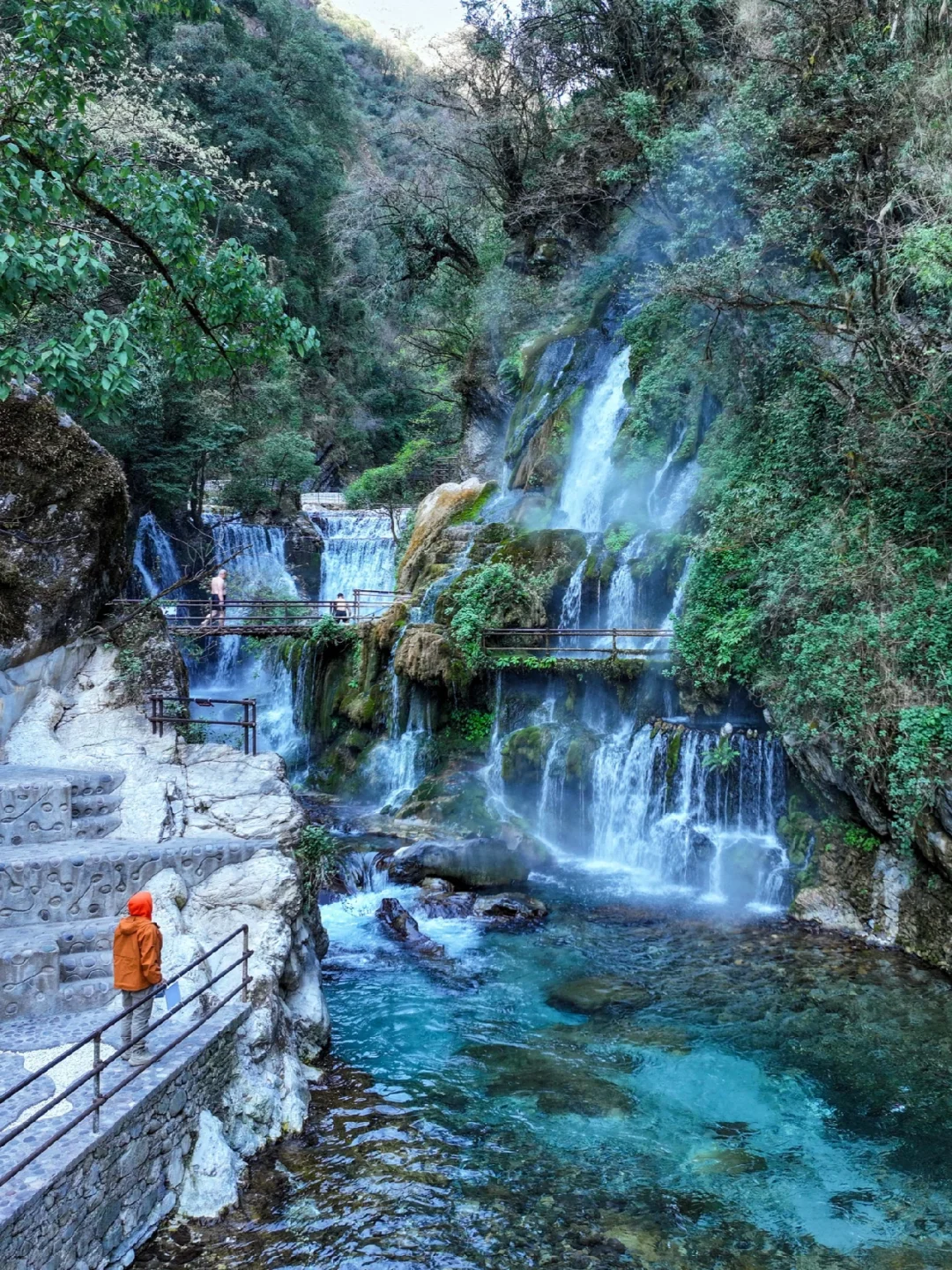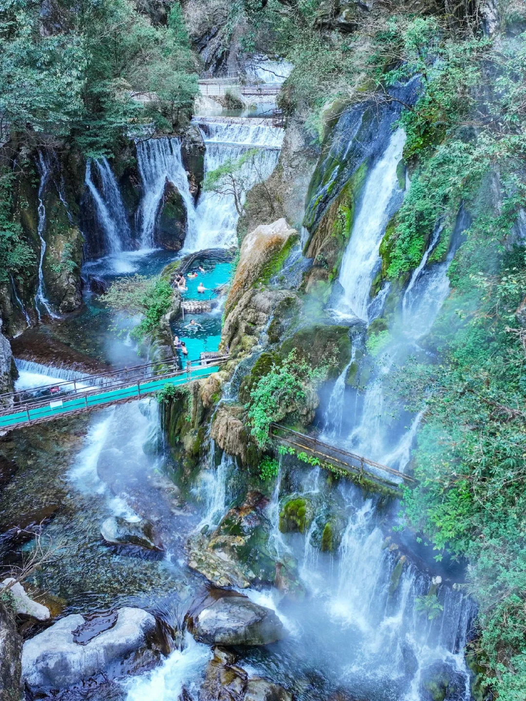 🏞️进入温泉区后,你会发现这里的环境十分优美。众多个小瀑布从高处落下,共同组成了瑰丽的瀑布群,是四川第一大瀑布群,高达100多米的落差,分布着各色形态的小瀑布,有大珠小珠落玉盘,有疑是银河落九天,有水雾腾空飘不定,有今古长如白练飞。