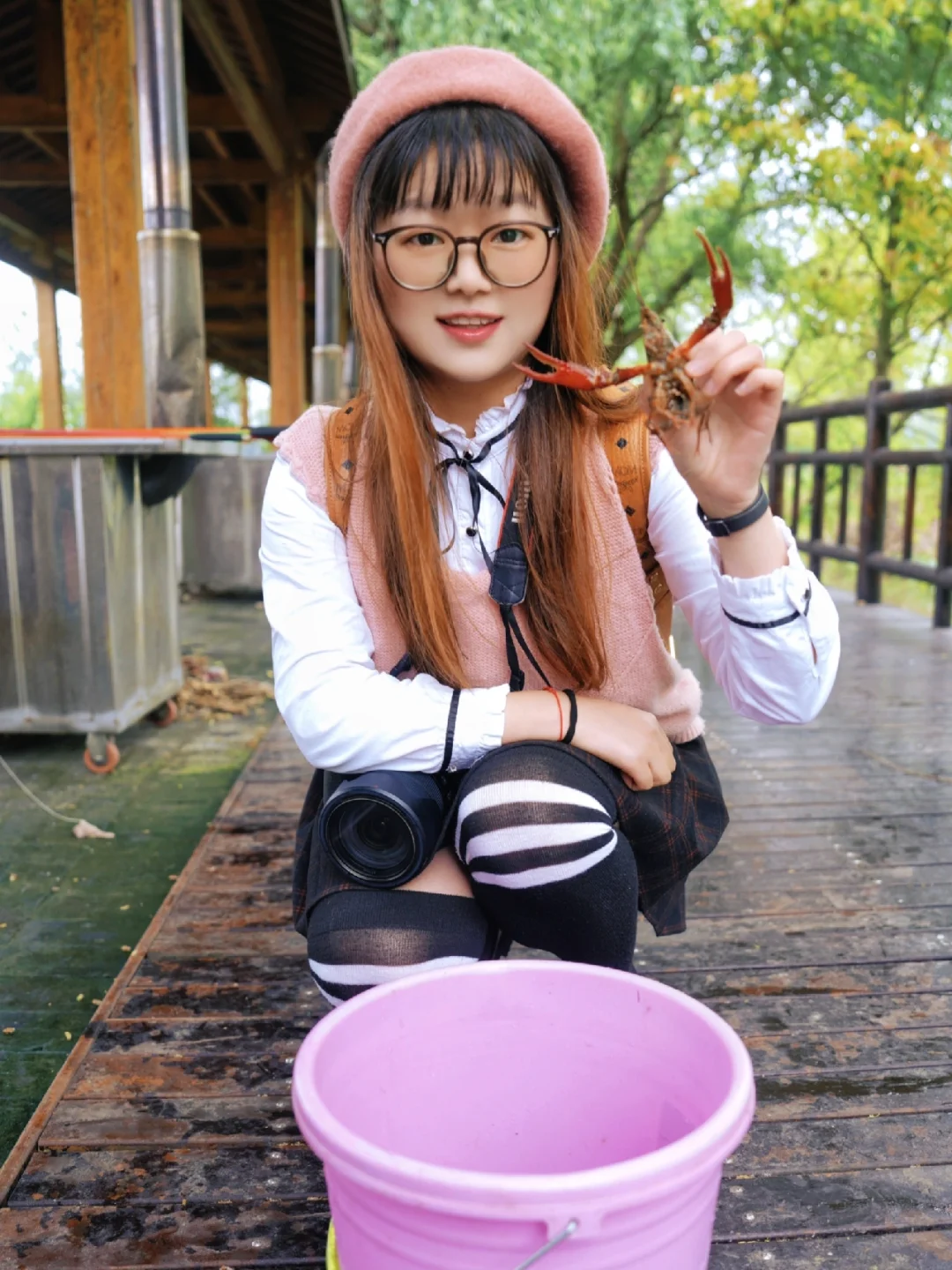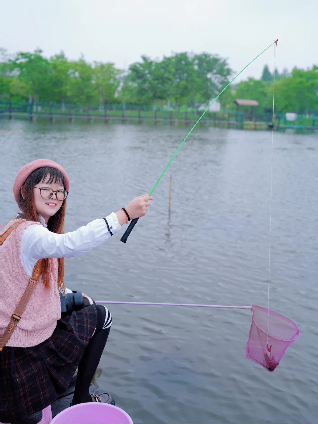 拿着绑好肉肉的杆子,拎着水桶,走在湖边,仿佛回到了儿童时代,经常放暑假背着妈妈跑出去钓龙虾~特开心~~