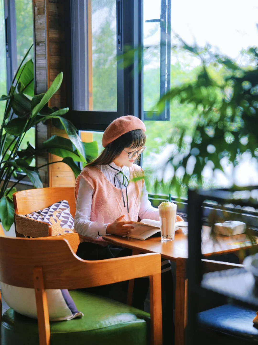 3)室内:一楼或二楼,选择低点的座位,点一杯咖啡,拿着一本书,假装看书,用一些绿植🪴作为前景遮挡,美好的画面就自然而出了。