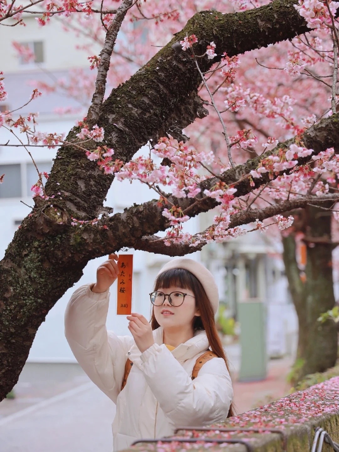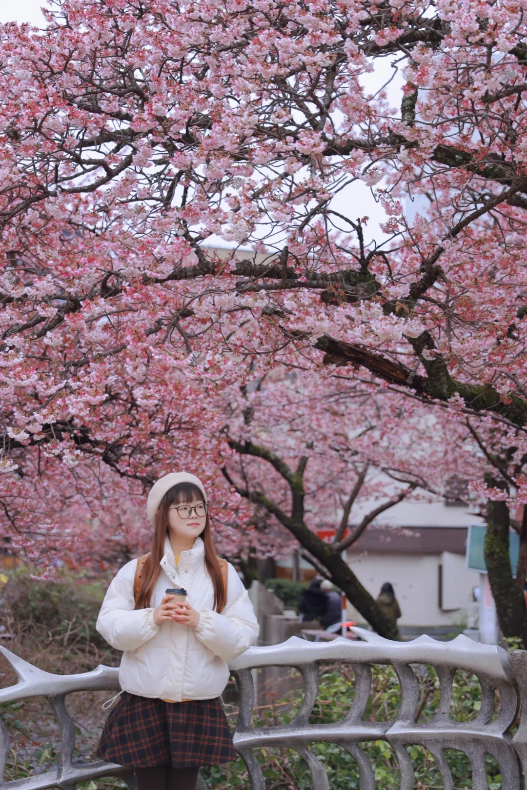 2️⃣找颗靠近桥🌉的挂了祈福书签🔖的樱花树,假装在看,在桥上拍,栏杆作为前景,如图3️⃣