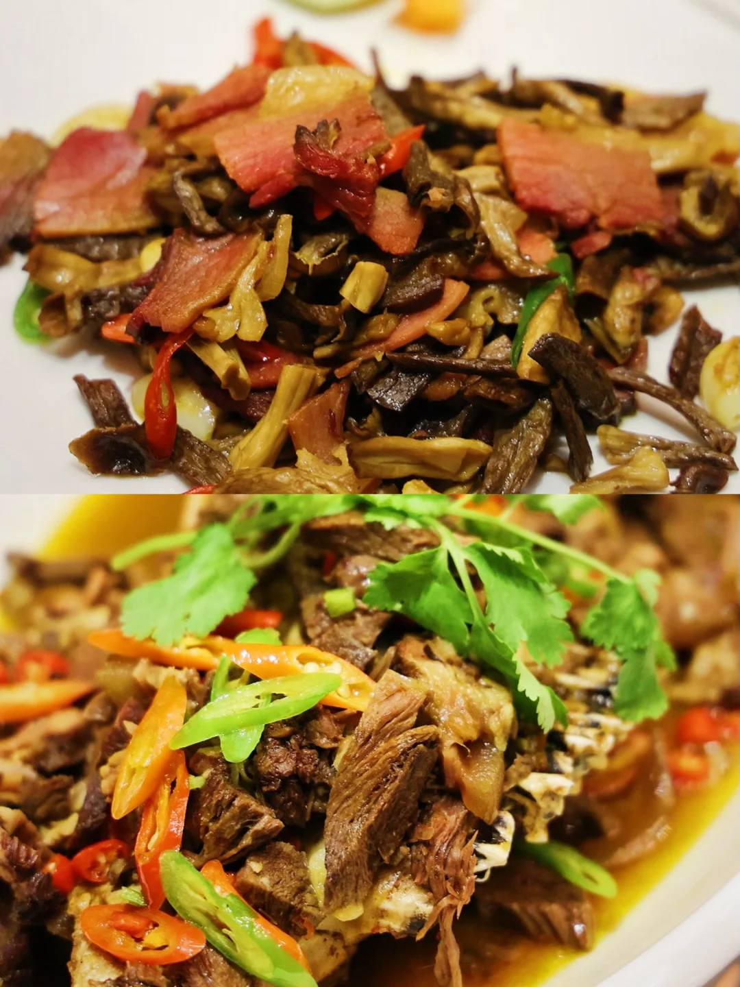 3️⃣炸广椒炒腊肉:一道特色菜,很多餐桌都有它的身影。腊肉清香、酢广椒酸辣,吃后使人胃口大开,是下饭的菜肴。
