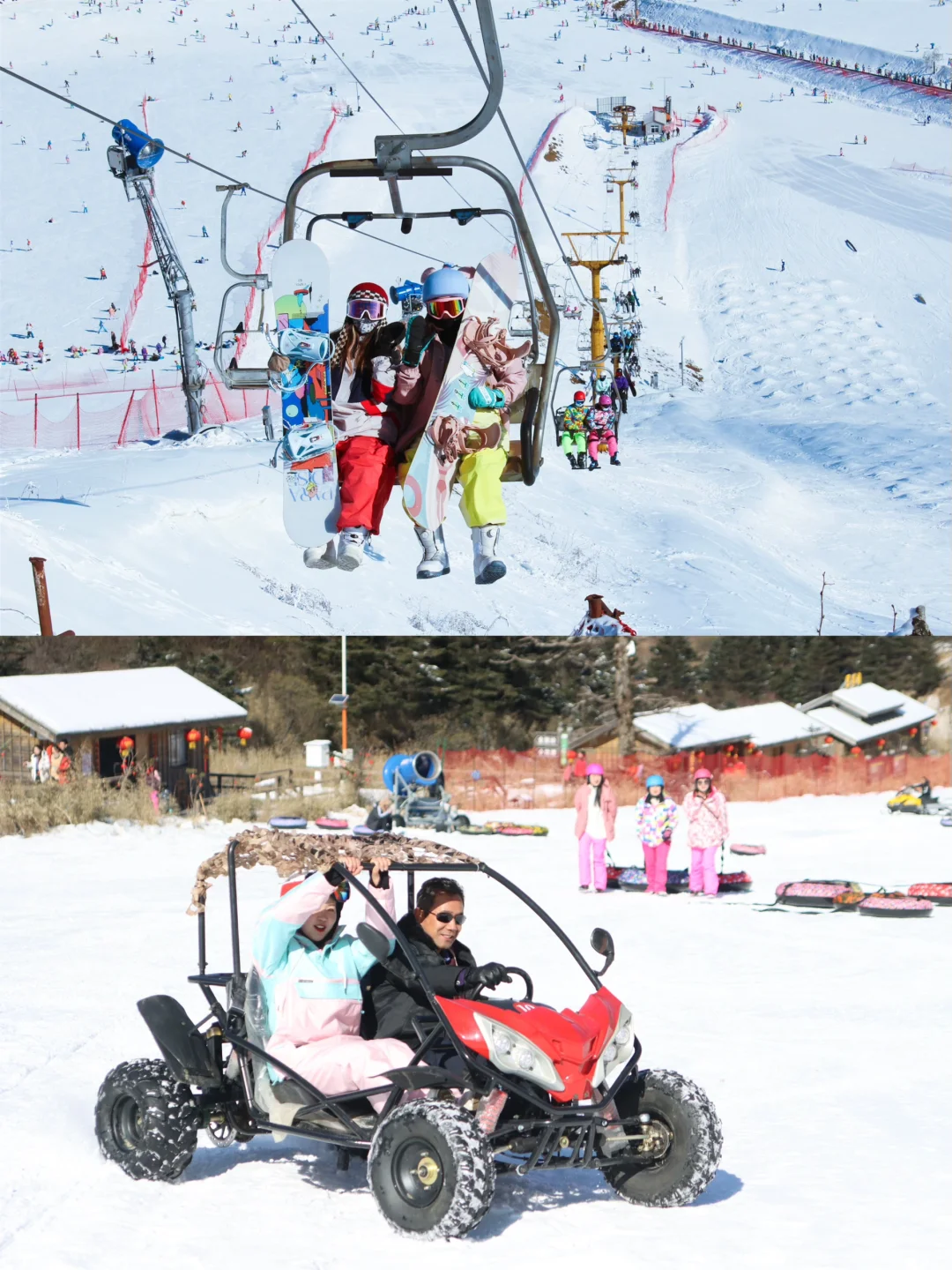 雪场有初、中、高级各类型难度的雪道十三条,雪道最大垂直落差210米。此外,还有雪地越野车、雪上香蕉船、雪上热气球、雪地坦克、冰上碰碰车等特色玩法。