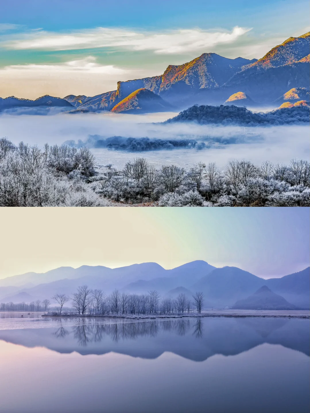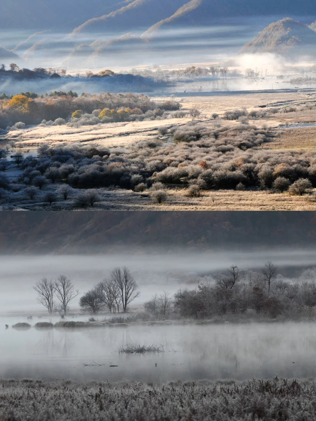 2️⃣大九湖:9个湖泊如明珠般镶嵌在群山之间,湖面结冰后宛如一面巨大的镜子,映照着天空中的白雪。晨雾缭绕,宛若仙境。漫步湖畔,仿佛置身于一个纯净的冰雪童话世界。