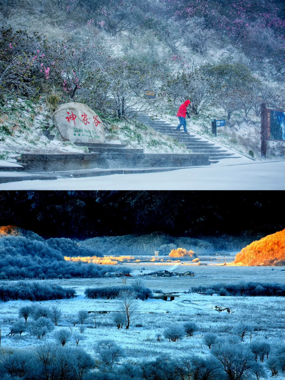 1️⃣神农顶:名副其实的“华中第一峰”,是观赏雪景的绝佳之地。站在海拔3105.4米的山巅,俯瞰群山被白雪覆盖,宛如银色的世界。无论是日出还是日落,都能让你感受到冬日恋歌的浪漫。