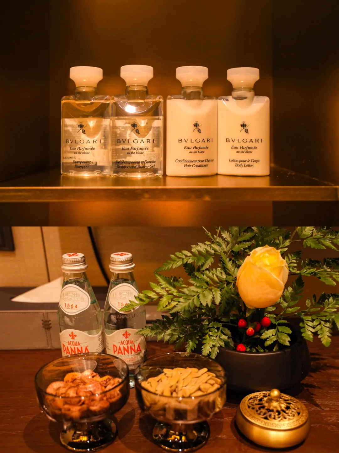 房间内的物品均是用了高端的品牌,如香皂、洗漱用品均是宝格丽,迷你吧冰箱里的饮料有巴黎水、Costa咖啡☕、椰子水等,床垫则是金可儿,鲜花🌸水果天天换新🆕……