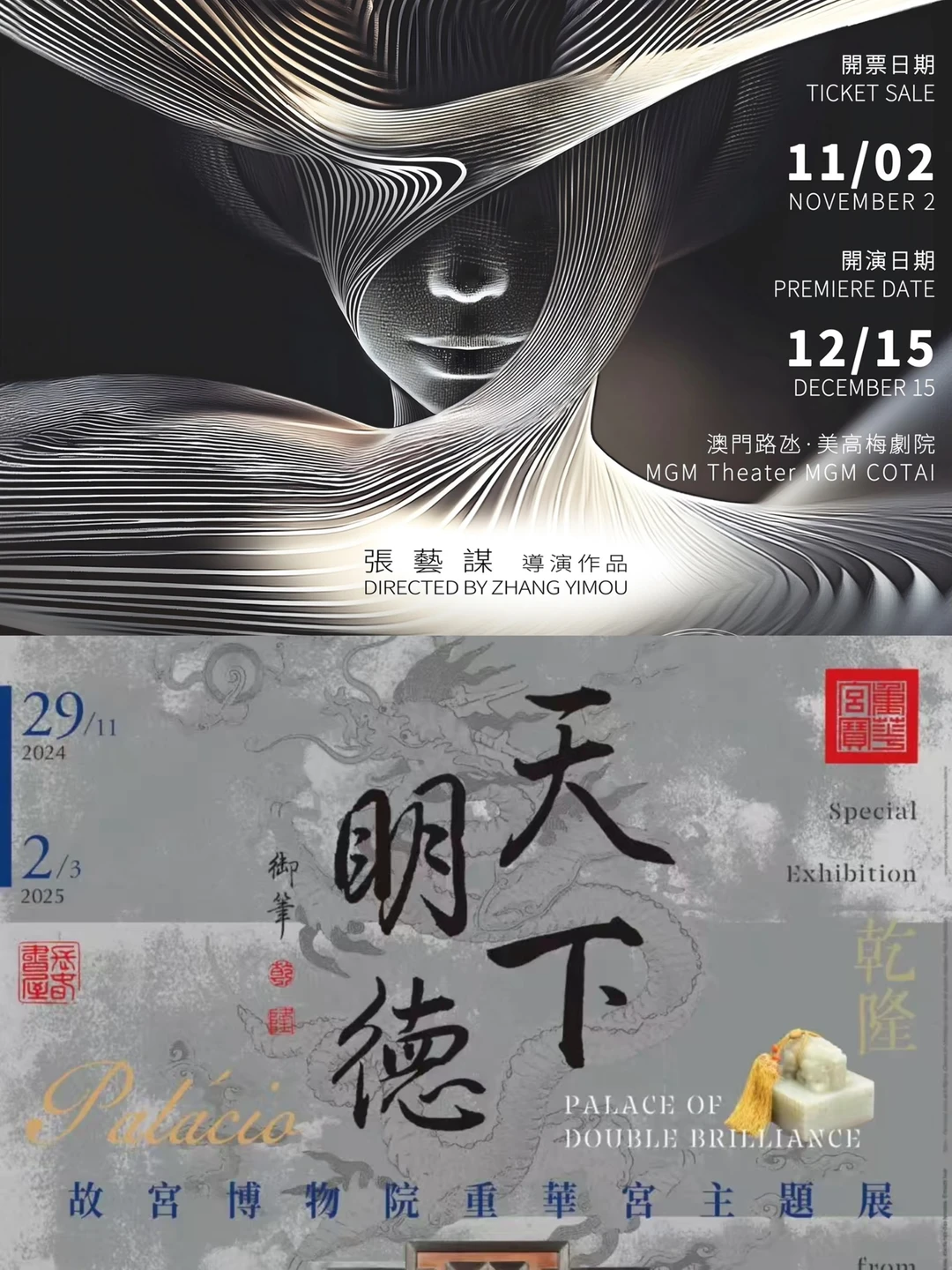 3️⃣各种好看到爆的展/演出:科技与艺术巨制《澳门2049》、天下明德-故宫博物院重华宫主题展、蓝色飘带—探索神秘海域 邂逅丝路遗珍