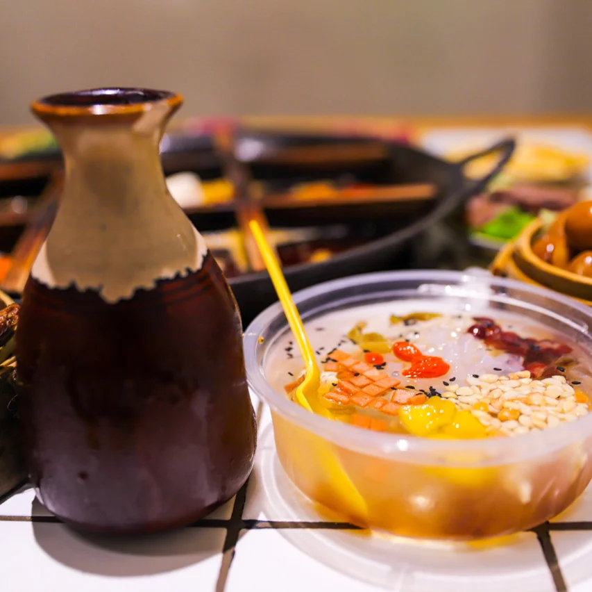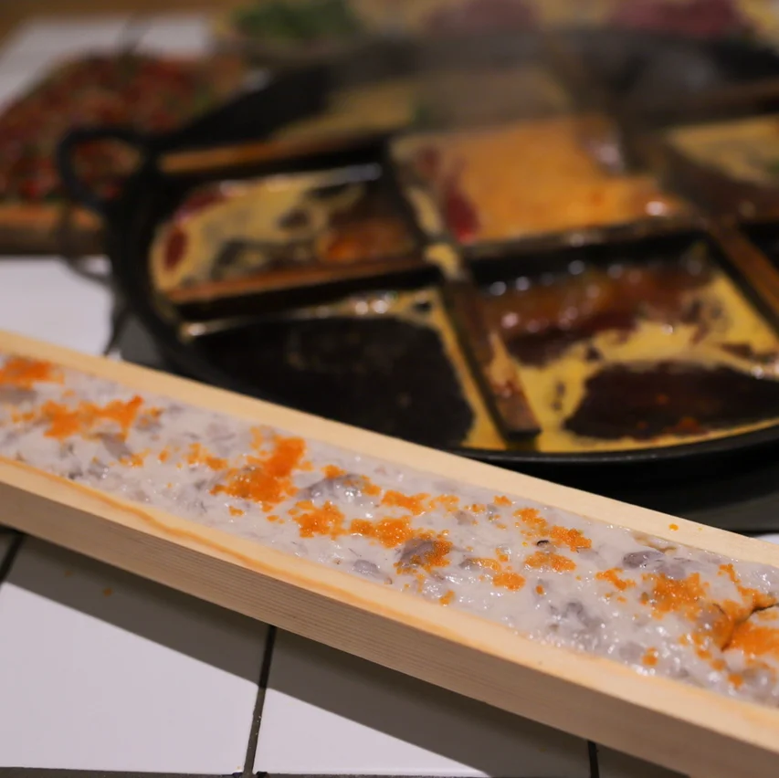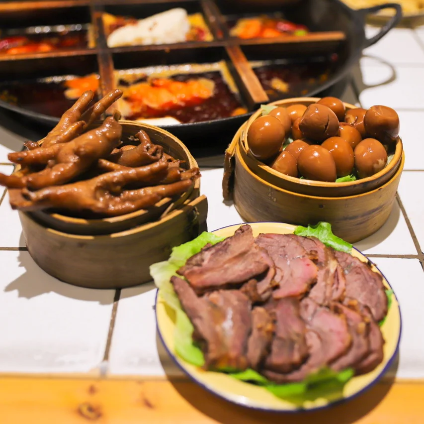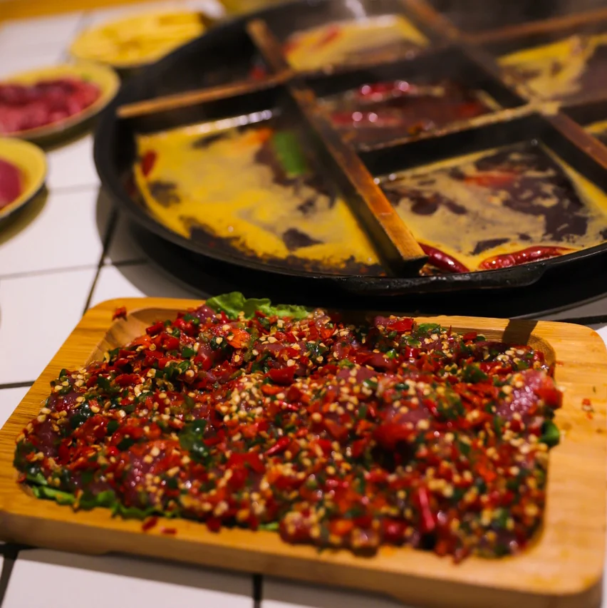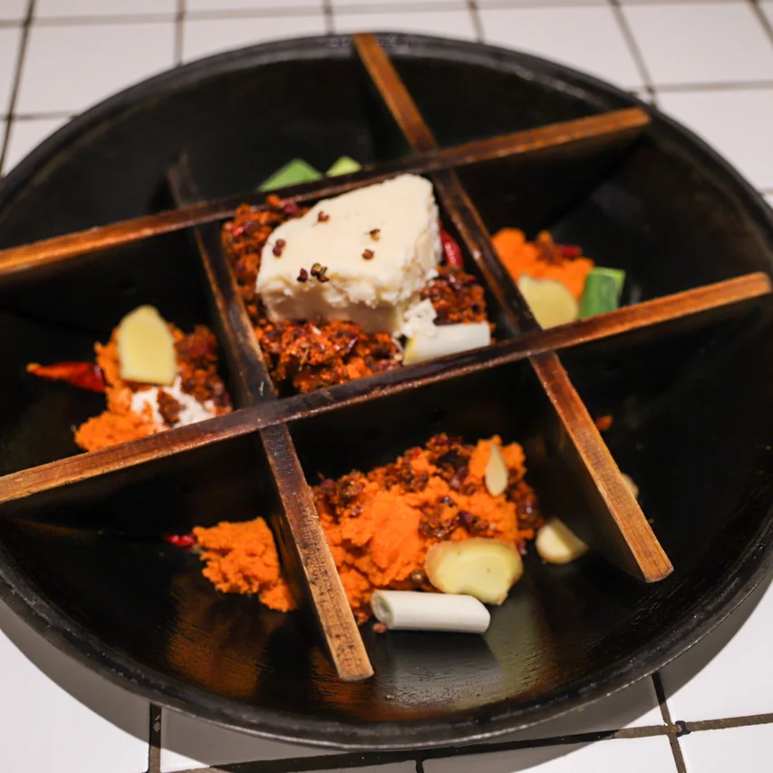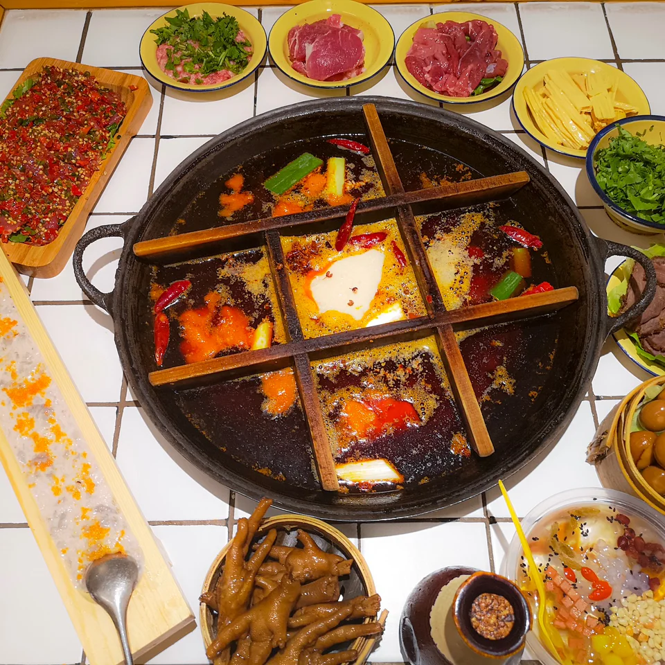 我们去瓜西西家吃的最多的就是这个传统的红油九宫格,真的是辣味十足鸭,搭配他们家秘制的香油以及干碟,堪称完美~上面还压着两个鹅暖石呢!它所有的配料底料,都是干货当场端上来的,不存在什么重复用油的情况