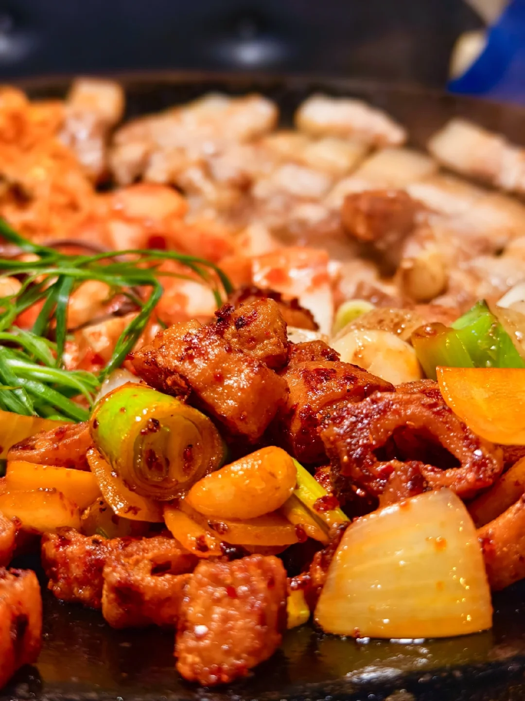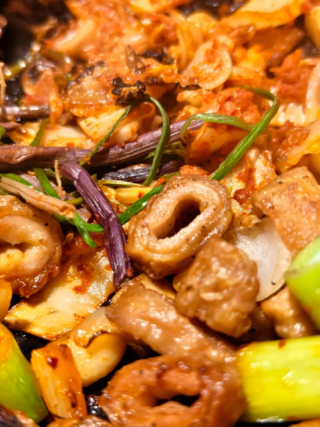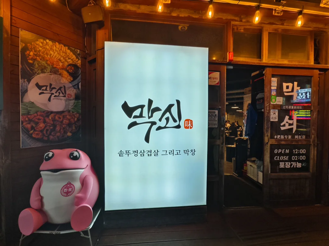 4.7w韩币,肥肠两种口味,原味和辣的,其中配了芝士,有芝士作为蘸酱才是灵魂啊。烤的大肠,外面脆脆的,怕腻的话,可以搭配着小菜吃,还可以包着生菜吃!!(发现基本任何一家店,都会送很多小菜🥗)不爱吃肥肠的人可以点别的~~