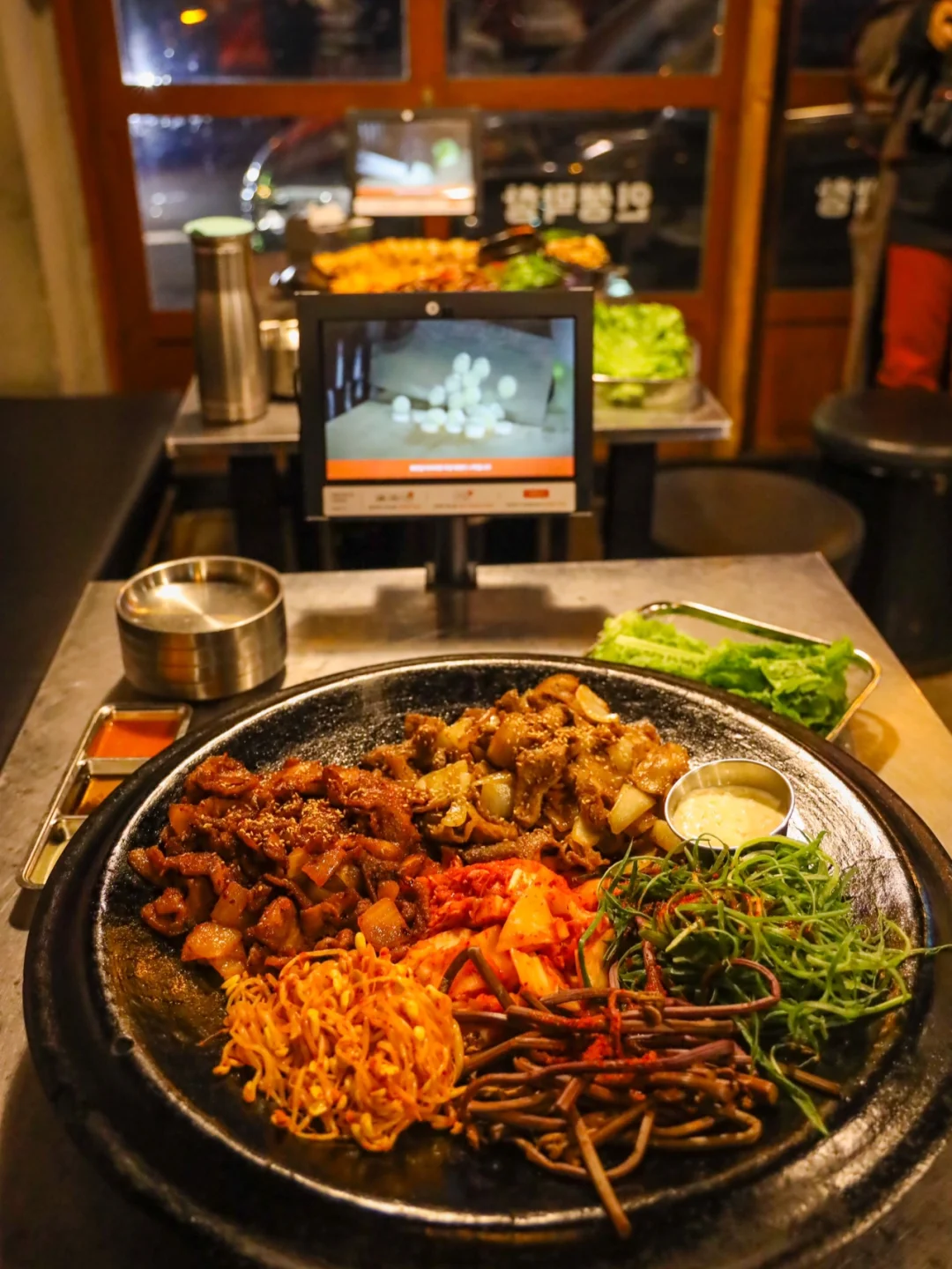 1.7w韩币,稍微了点辣肥肠在里面一起烤,还有蕨菜、豆芽、辣白菜作为配菜放在里面!