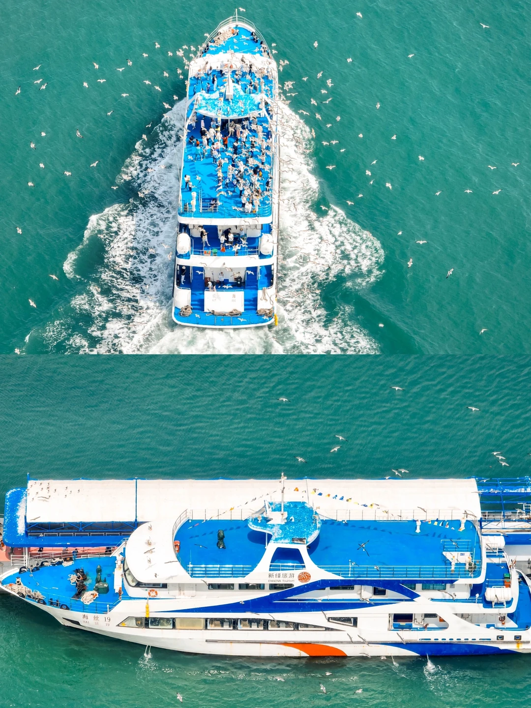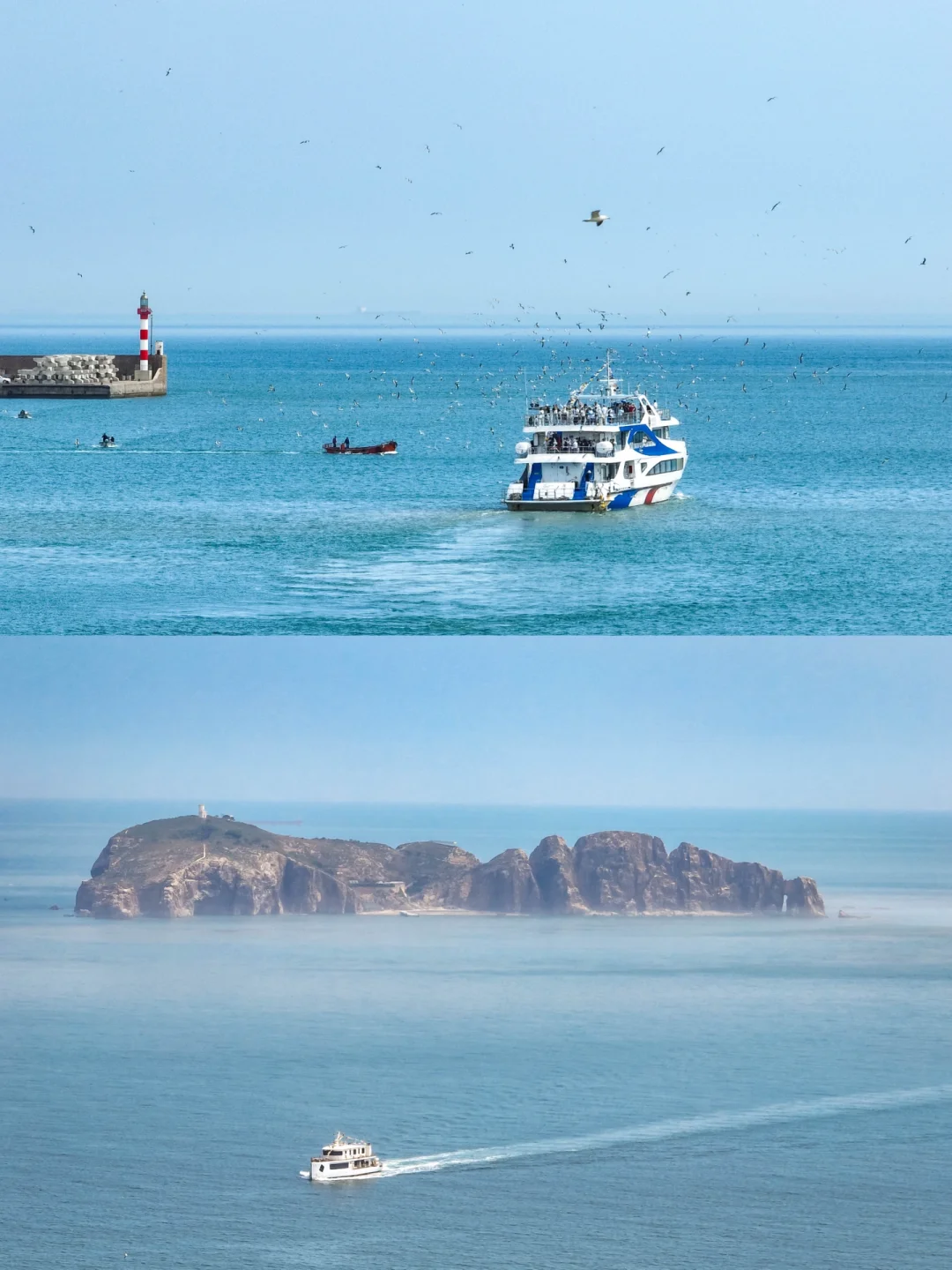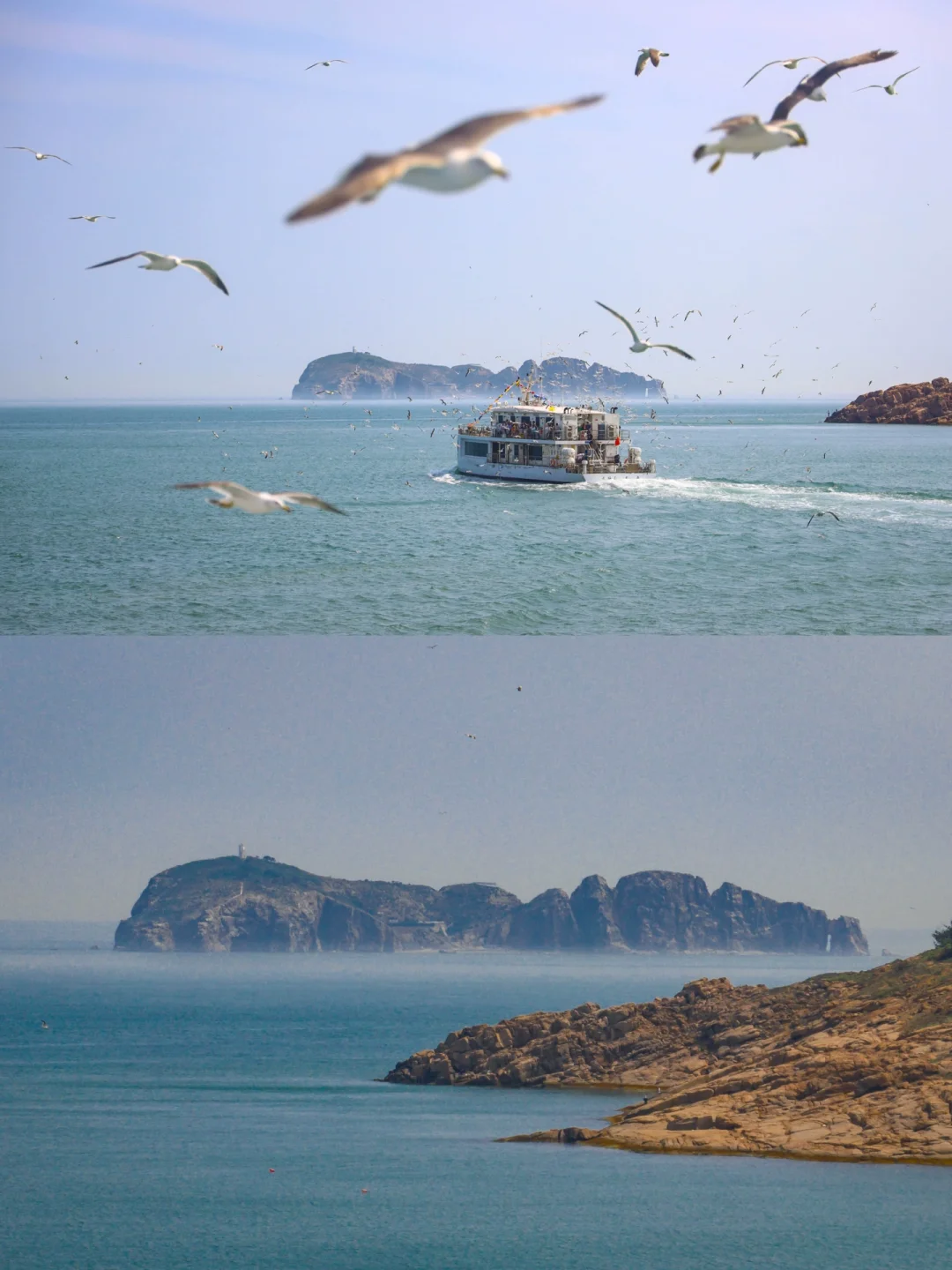 👀游船徐徐开来,在海上留下雪白的浪花,眼前是辽阔的大海,晴好的天气让不远处的海驴岛清晰可见,海浪有节奏地拍打着游船,大自然的白噪音有着安抚人心的效果,眼睛和心都从俗尘凡事中收了回来,只沉醉于当下的美景。