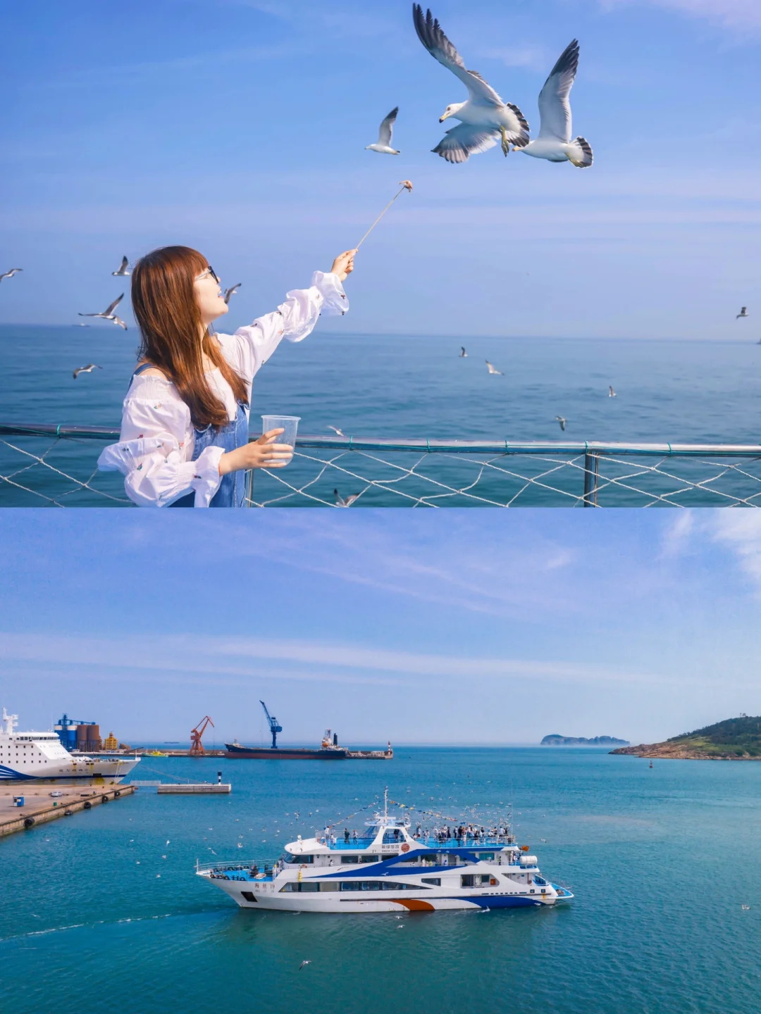 ⁽⁽ଘ😇ଓ⁾⁾海驴岛的海鸥或许是见惯了这种场面,所以一点都不怕人,面对拿着小鱼小虾的游客们,海鸥们不争不抢,很有礼貌。雪白的羽毛如同海上的精灵,掠过天空,活跃在人群之上,十分精准,不愧是“海上叼食冠军”。