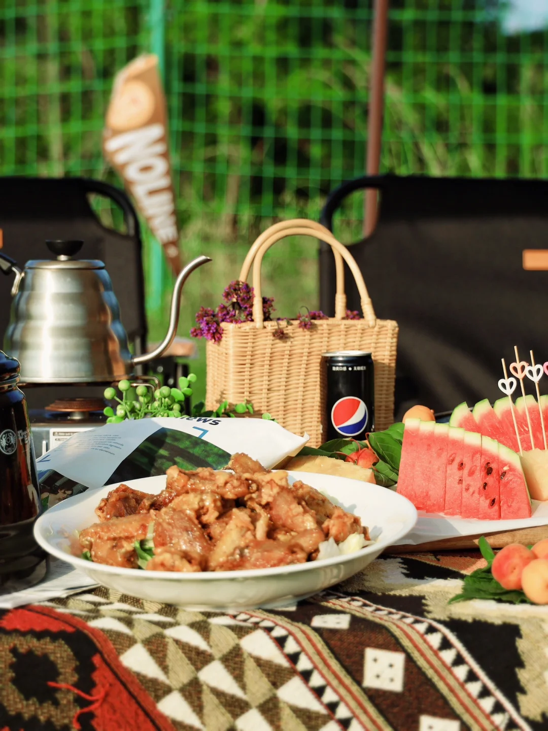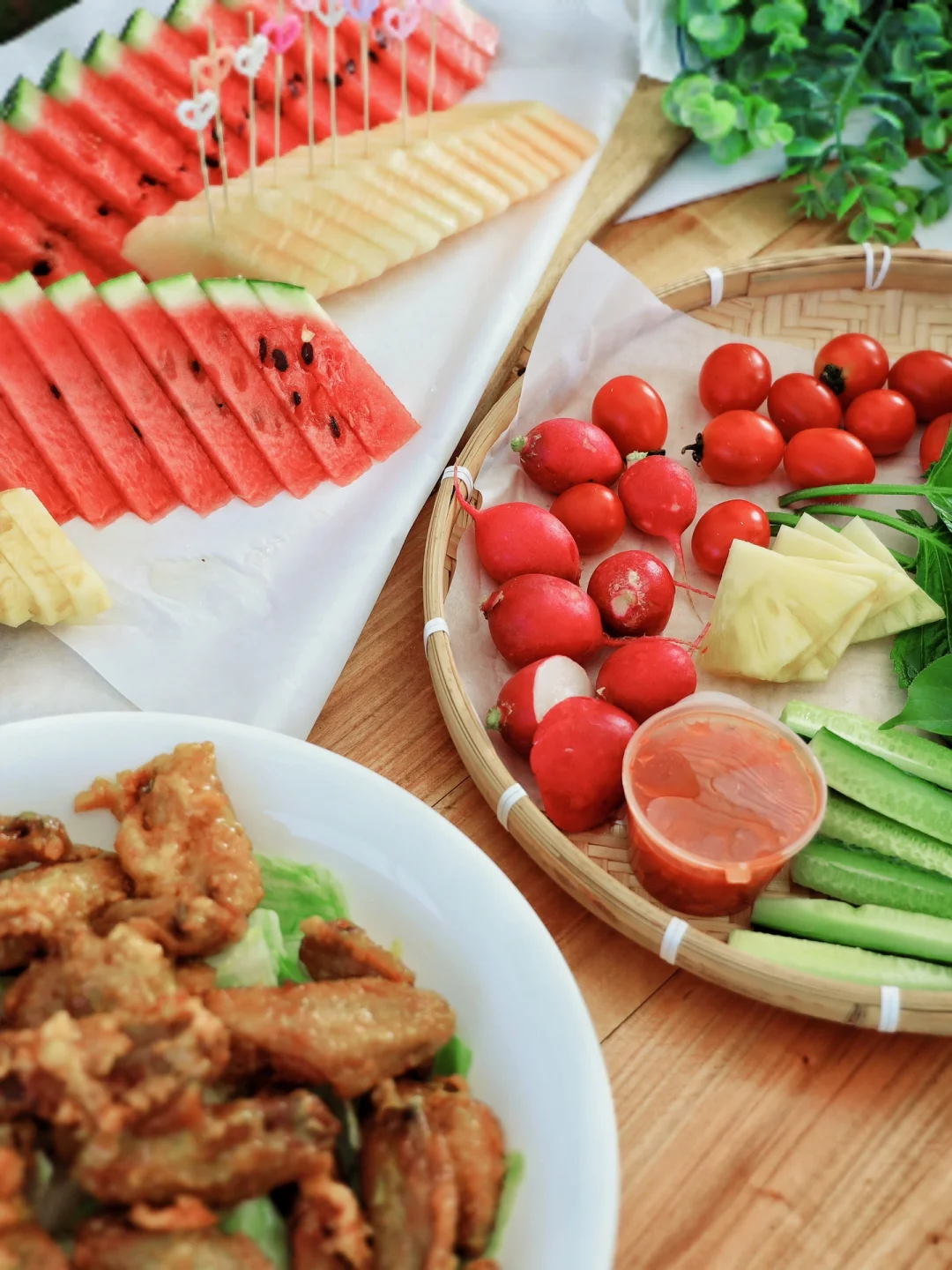 摆盘水果,撒着孜然烤着肉🥩,
