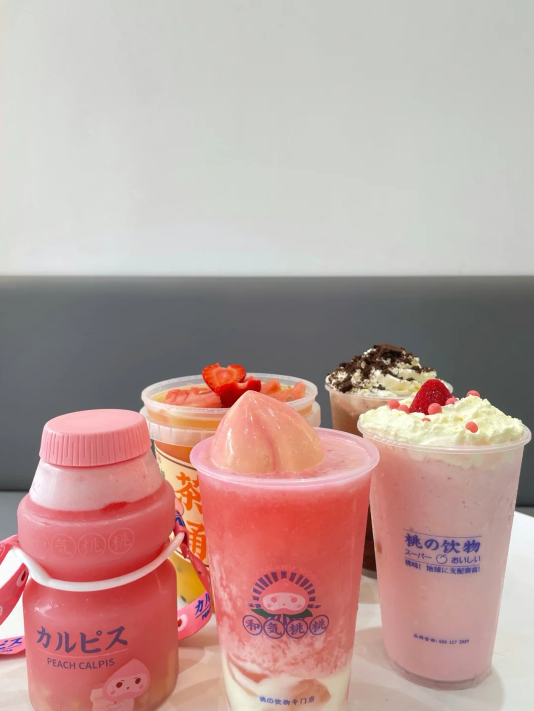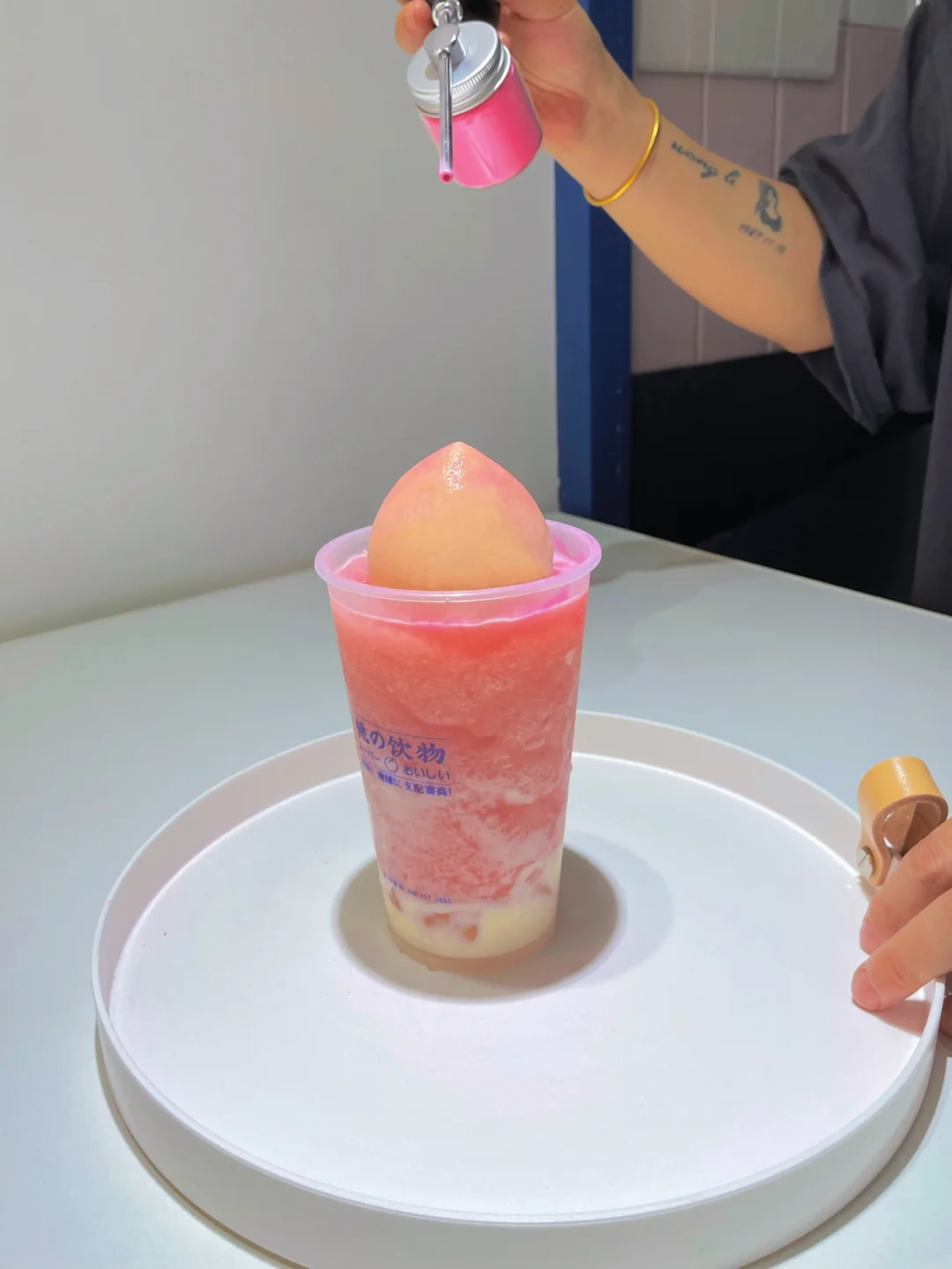 一颗粉桃🍑桃:一整颗桃子立在上面 本来以为是布丁做的 没想到竟然是奶酪 下面是水蜜桃冰沙