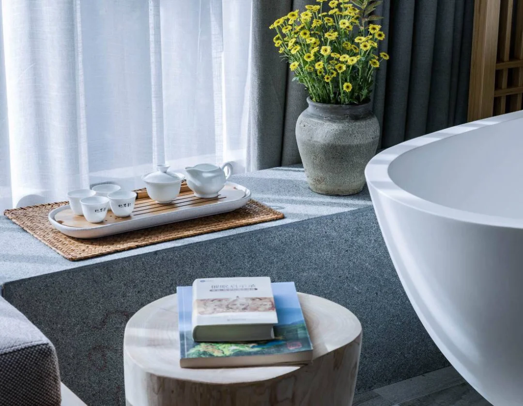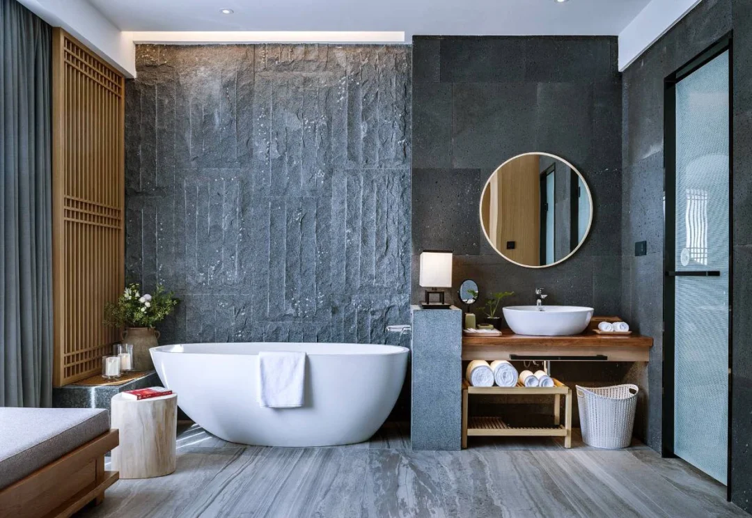 每个房间都设有开放式的大浴缸,靠景的地方有敞亮的落地窗,所有公共区域都铺设了地暖,舒适的床品都是高端大气的。