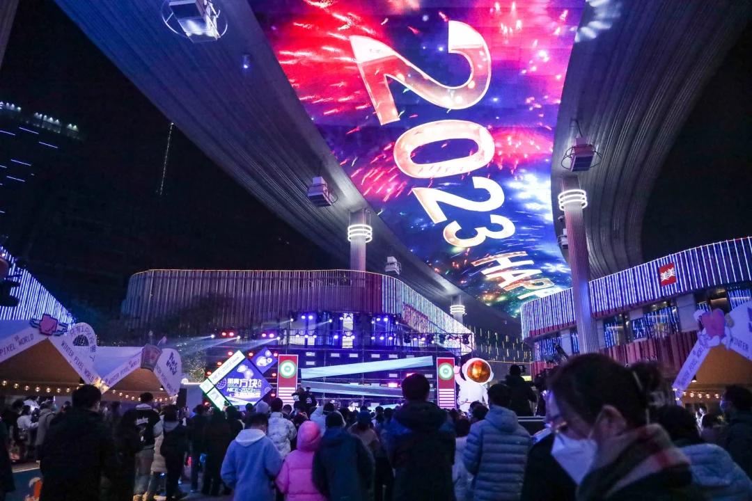 圆融天幕街:大屏时时滚动着“2023 happy new year”,📣📣📣环保的烟花🎆不停的绽放着。