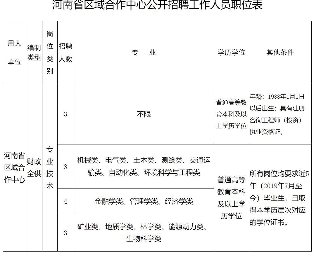 河南省区域合作中心招聘专业技术岗位工作人员13名。该单位是河南省发展和改革委员会直属正处级公益二类事业单位,经省编办批准加挂了河南省一带一路建设促进中心的牌子。主要职责是:参与全省区域经济发展和“ 一带一路”建设等政策法规研究;参与黄河流域生态保护和高质量发展、淮河生态经济带、汉江生态经济带等重大国家战略的推进落实工作,协助开展对口支援、南水北调水源地结对合作;参与推动“四路”协同发展,承担重要规划、重大工程项目可行性研究报告编制和项目建设咨询服务等工作。