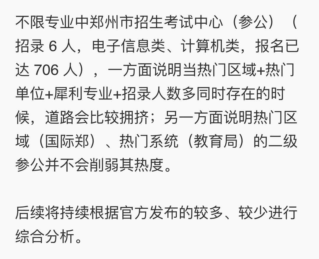 不限专业中郑州市招生考试中心(参公)(招录6人,电子信息类、计算机类,报名已达706人),一方面说明当热门区域+热门单位+犀利专业+招录人数多同时存在的时候,道路会比较拥挤;另一方面说明热门区域(国际郑)、热门系统(教育局)的二级参公并不会削弱其热度。