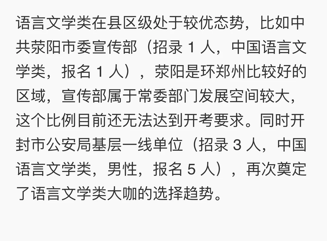 语言文学类在县区级处于较优态势,比如中共荥阳市委宣传部(招录1人,中国语言文学类,报名1人),荥阳是环郑州比较好的区域,宣传部属于常委部门发展空间较大,这个比例目前还无法达到开考要求。同时开封市公安局基层一线单位(招录3人,中国语言文学类,男性,报名5人),再次奠定了语言文学类大咖的选择趋势。