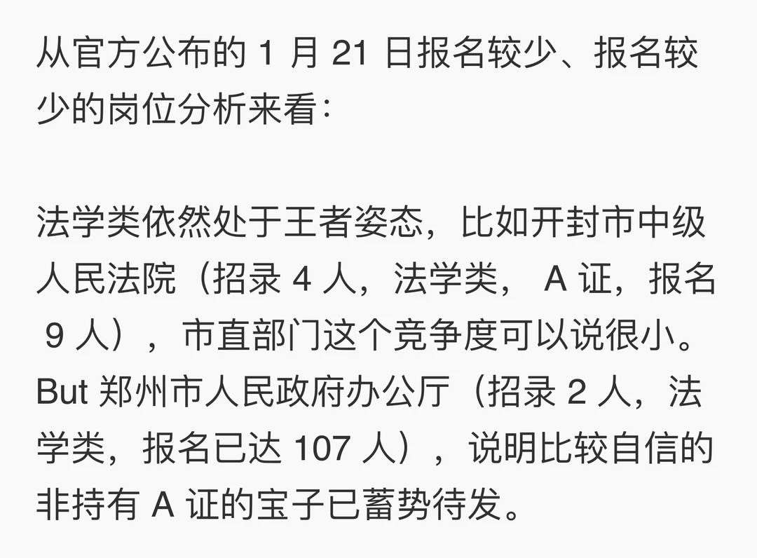 法学类依然处于王者姿态,比如开封市中级人民法院(招录4人,法学类,A证,报名9人),市直部门这个竞争度可以说很小。But郑州市人民政府办公厅(招录2人,法学类,报名已达107人),说明比较自信的非持有A证的宝子已蓄势待发。