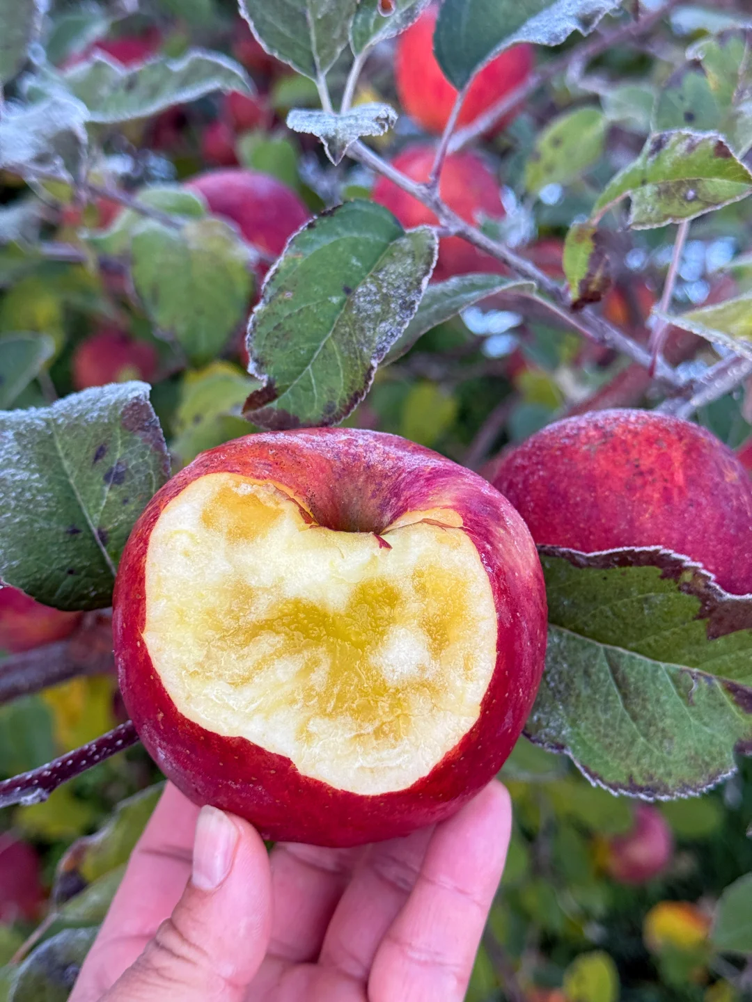 叶子上打满了厚厚的冰霜,苹果才是真得糖心!