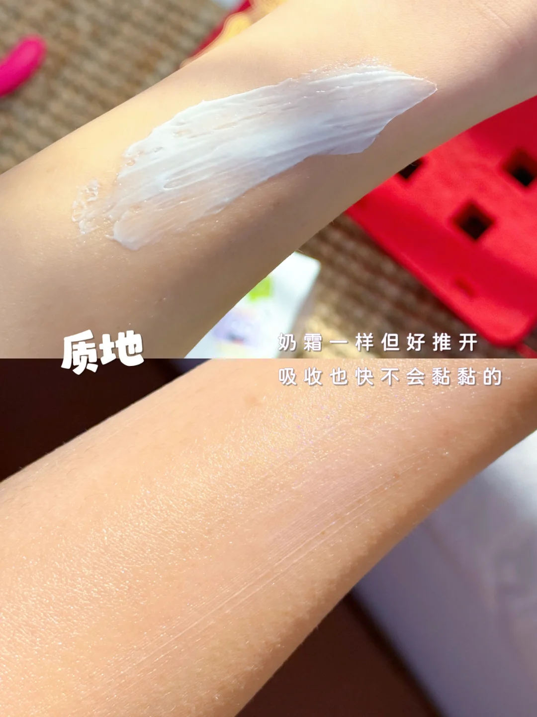 这面霜是软乎乎的奶霜质地,挖一点涂脸上润润的,半点不黏头发。脸蛋要是吹得红扑扑,厚涂一层睡一觉,起皮的地方都变软fufu的。这个就是自然的润,出门疯玩一下午,脸蛋还是水当当的,0度天的保湿力真的可以!