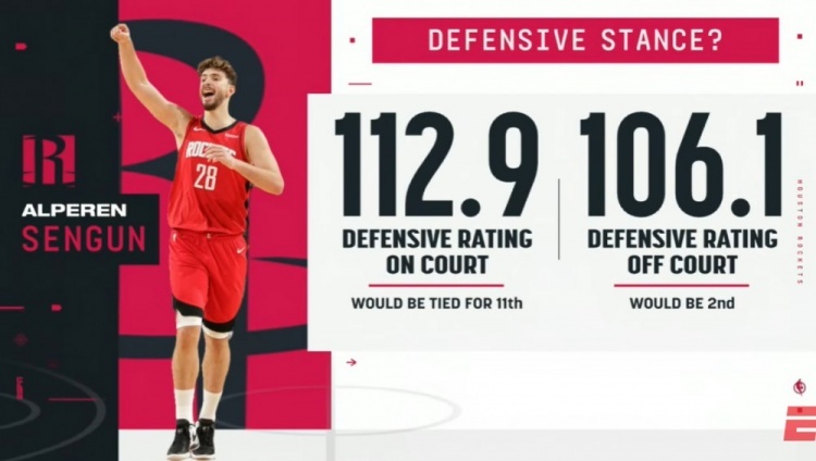 申京在场火箭防守效率联盟第11 ,下场后升至第2!