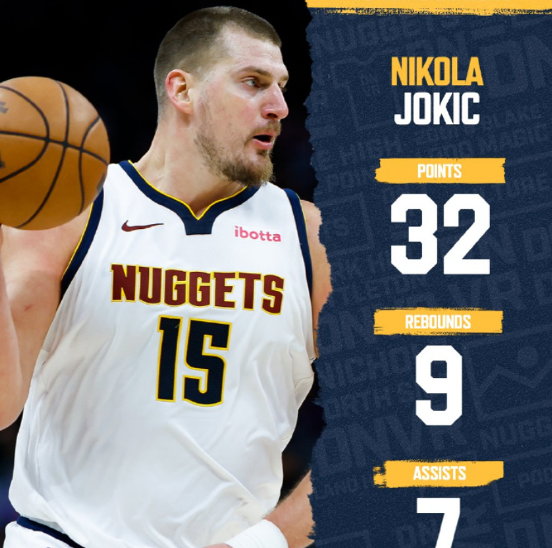 约基奇29分钟时间拿到32分9篮板7助攻,穆雷25分6篮板6助攻,这是两人生涯第18次同场比赛拿到25+5+5的数据,斯特劳瑟19分,小哈达威19分