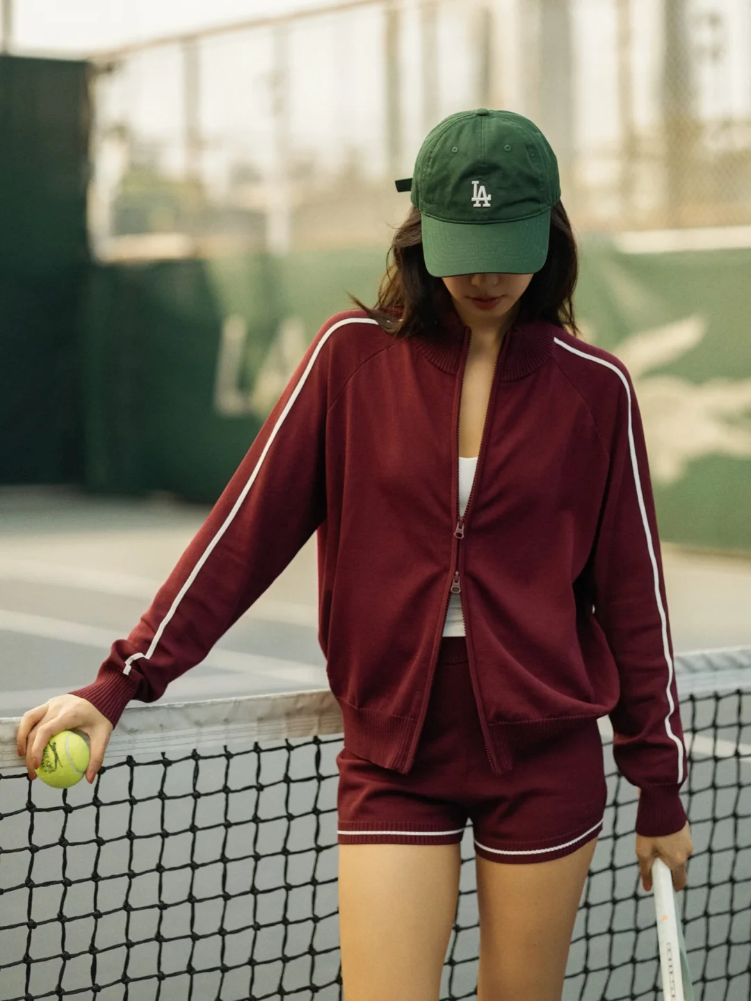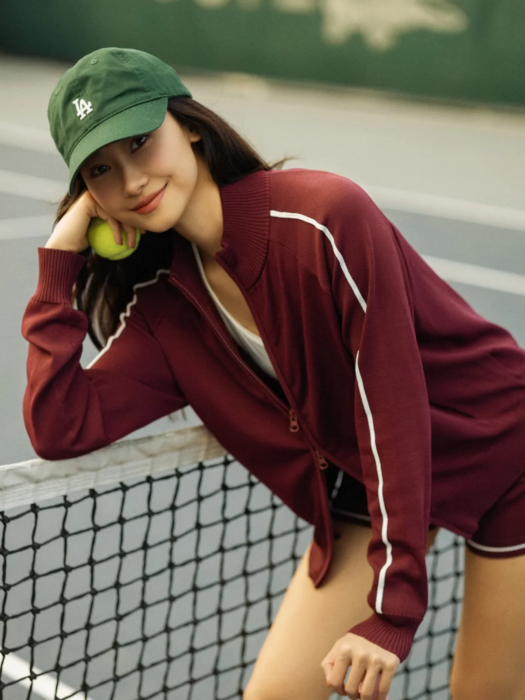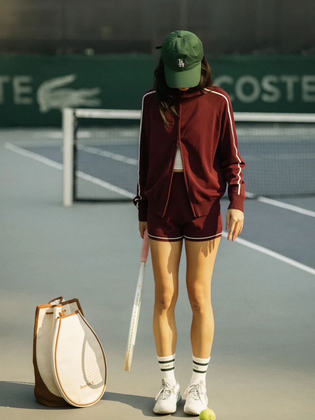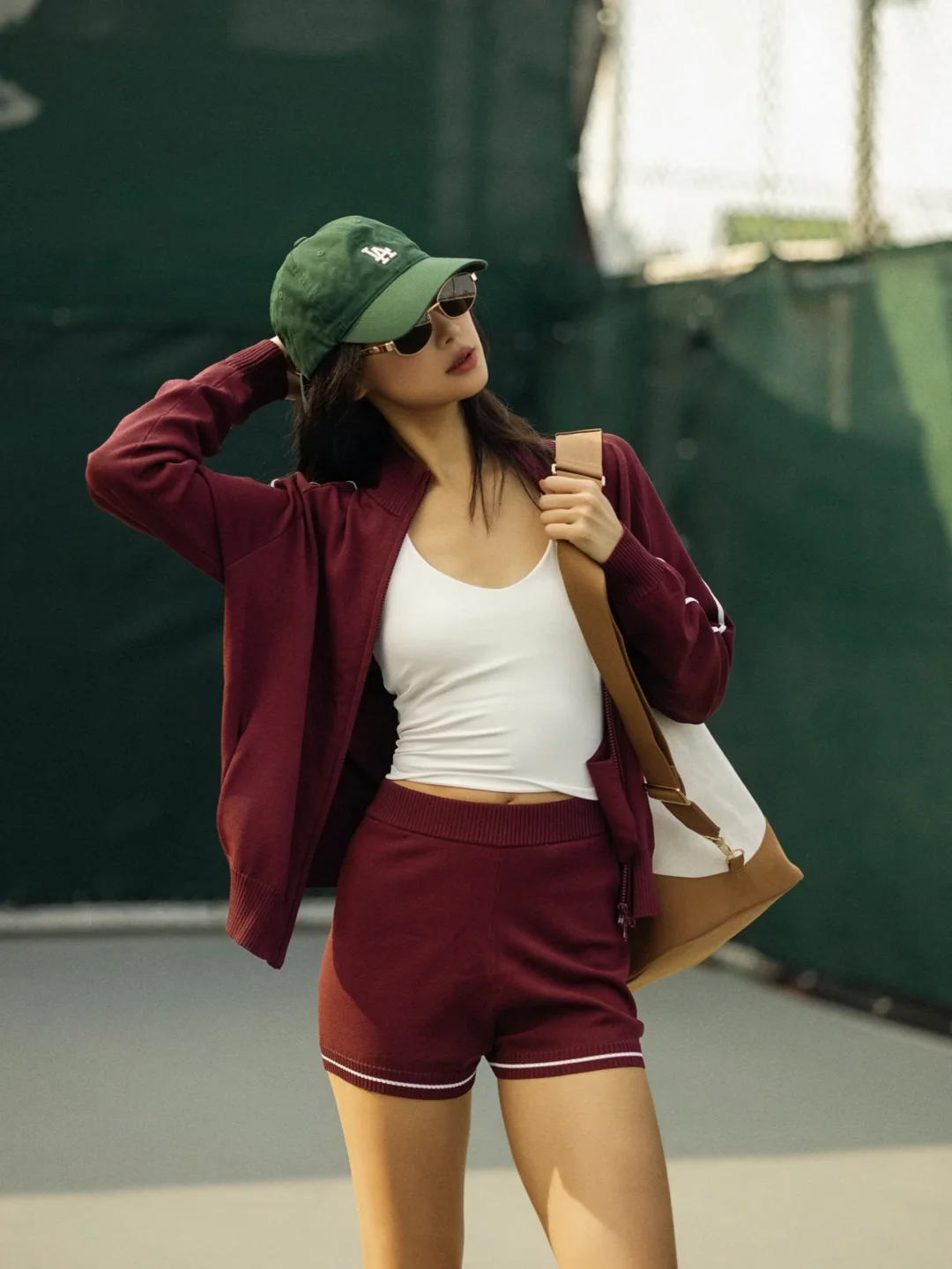 酒红针织套装和墨绿棒球帽的经典撞色,再➕复古球包灵魂点缀,直接梦回90年代美式网球场🏟️