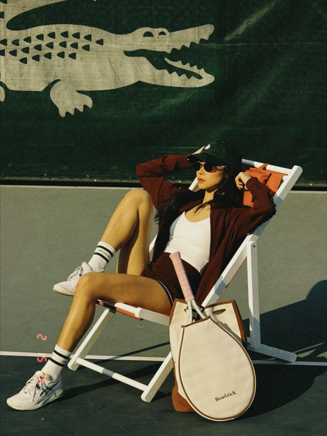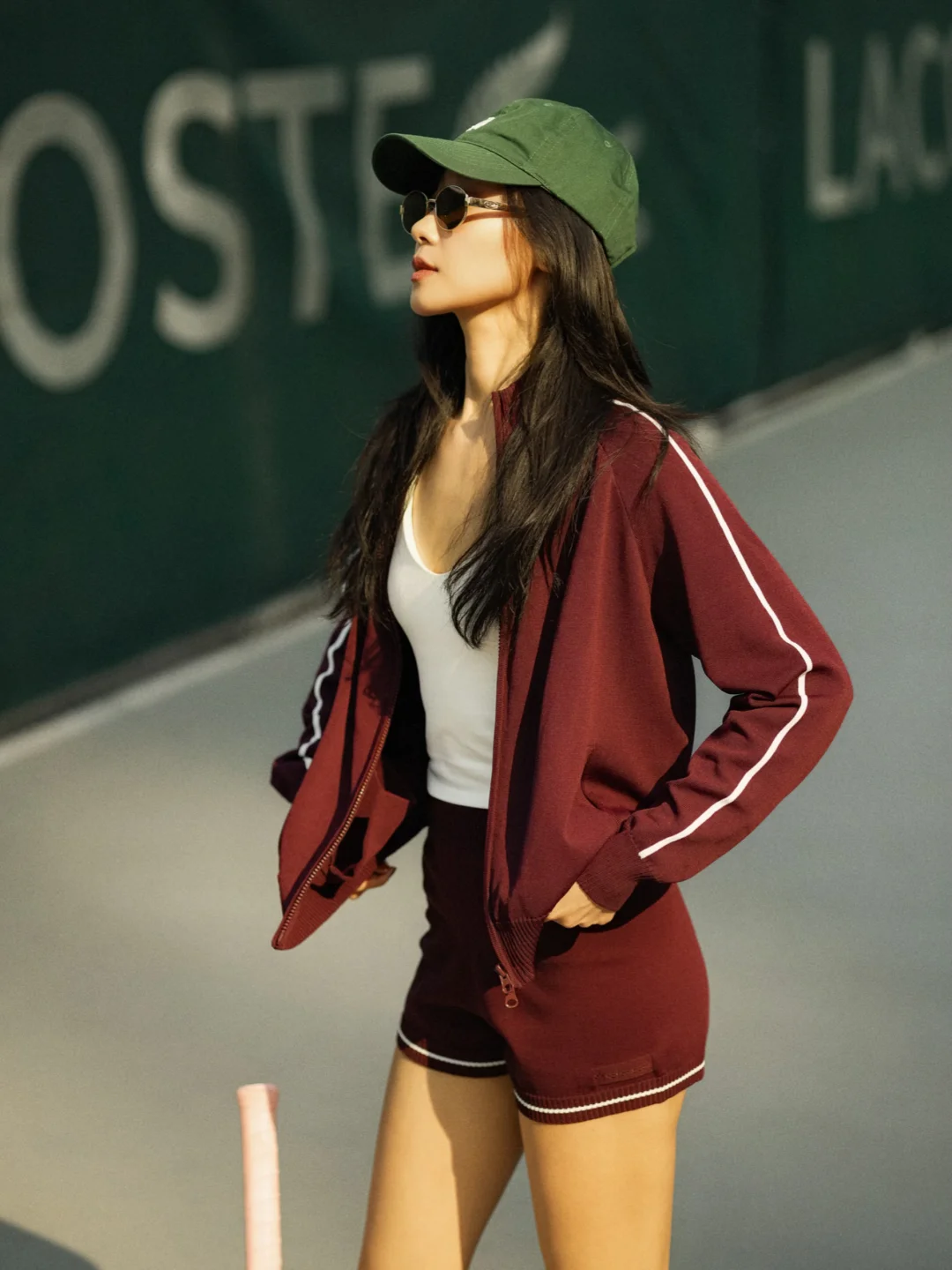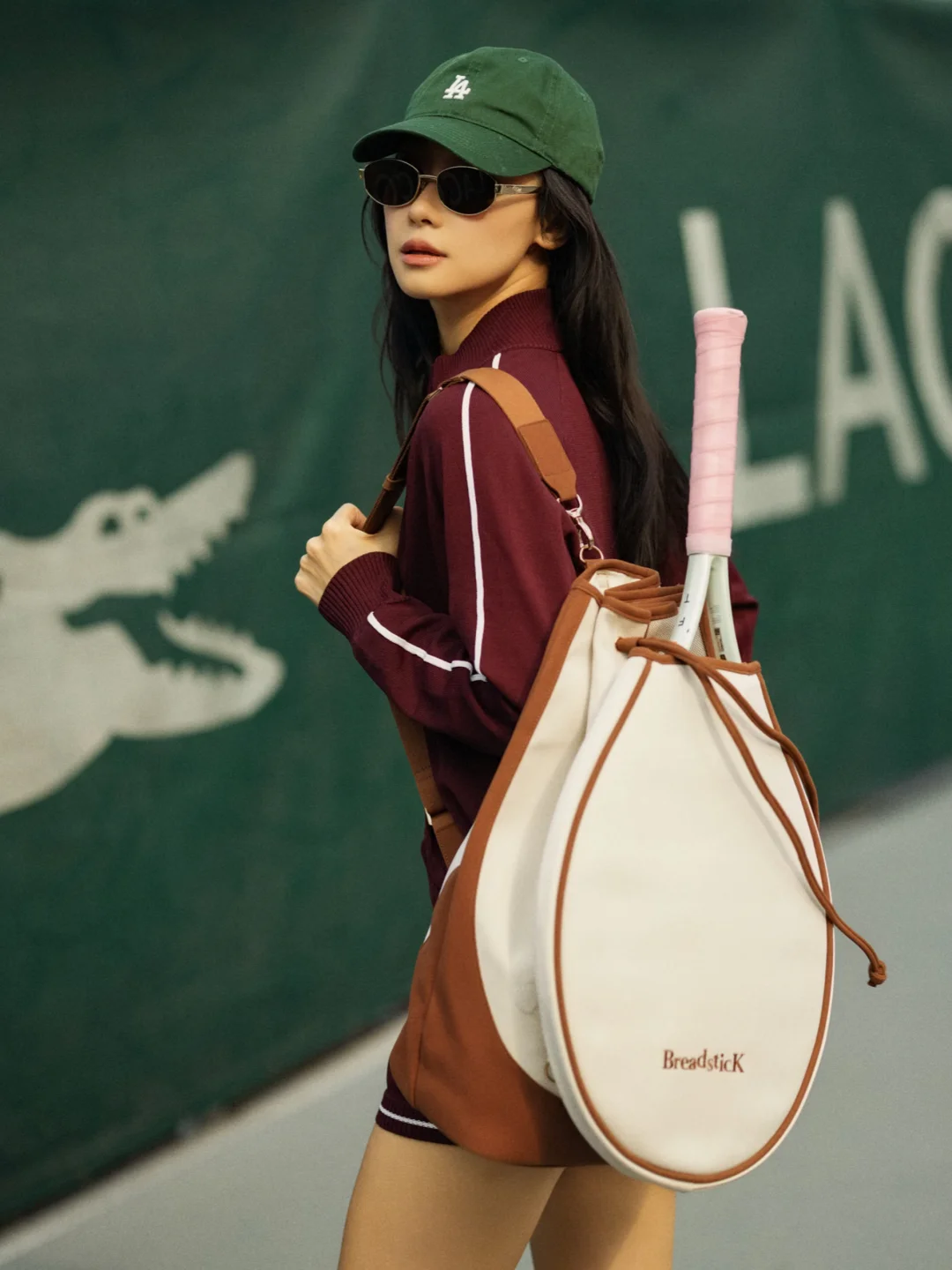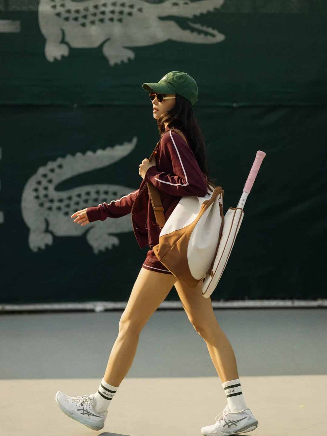 酒红针织套装和墨绿棒球帽的经典撞色,再➕复古球包灵魂点缀,直接梦回90年代美式网球场🏟️