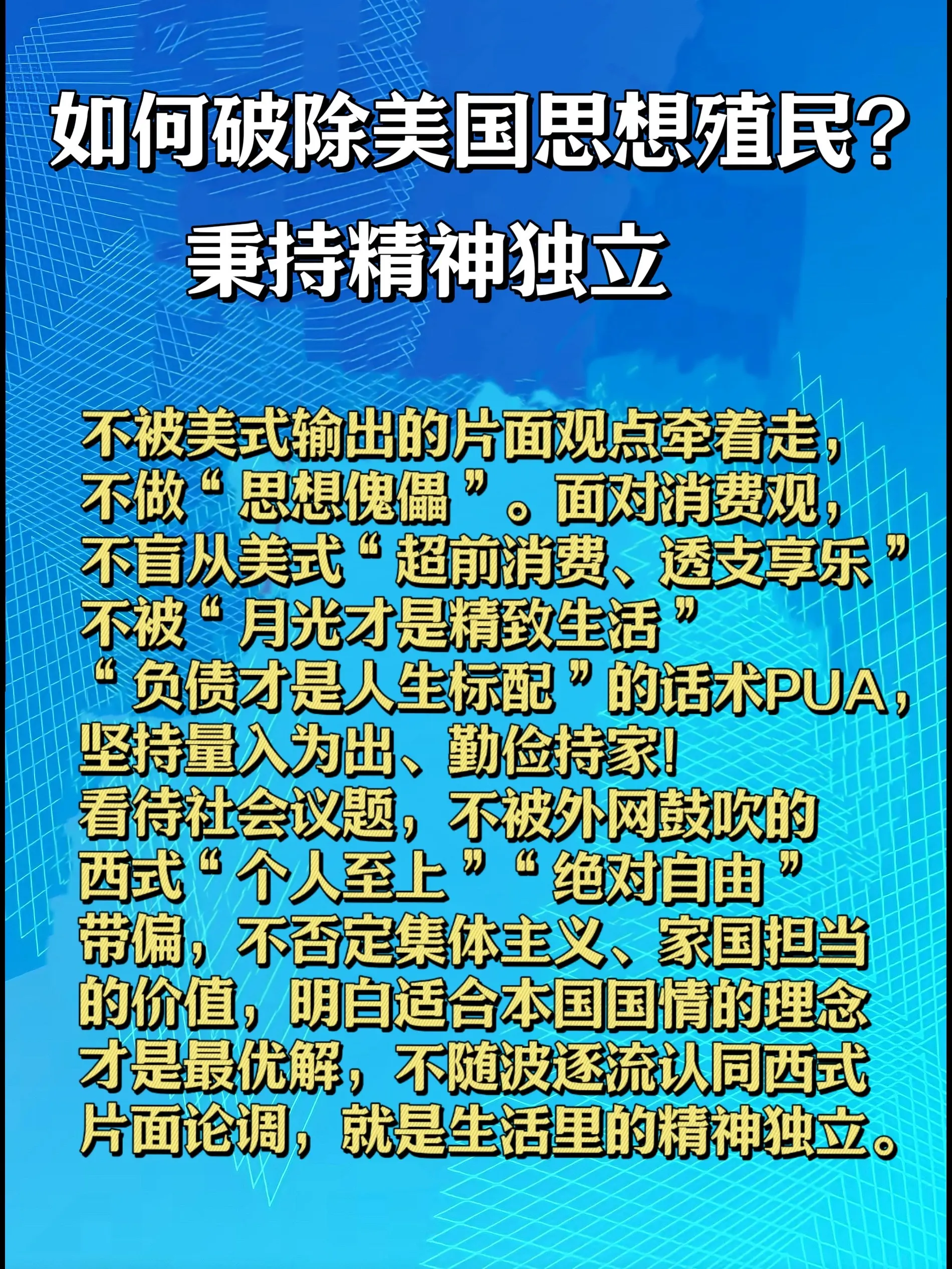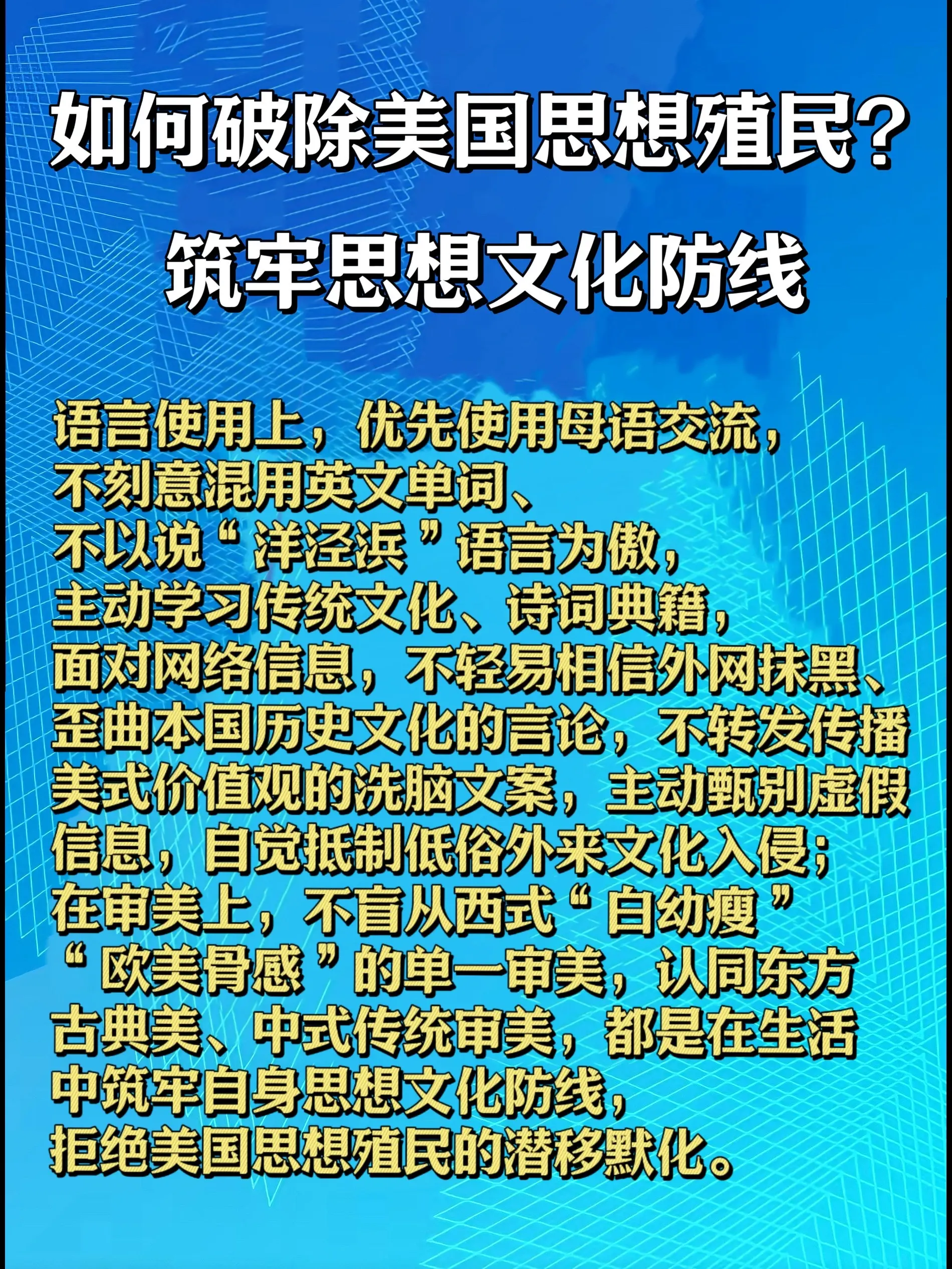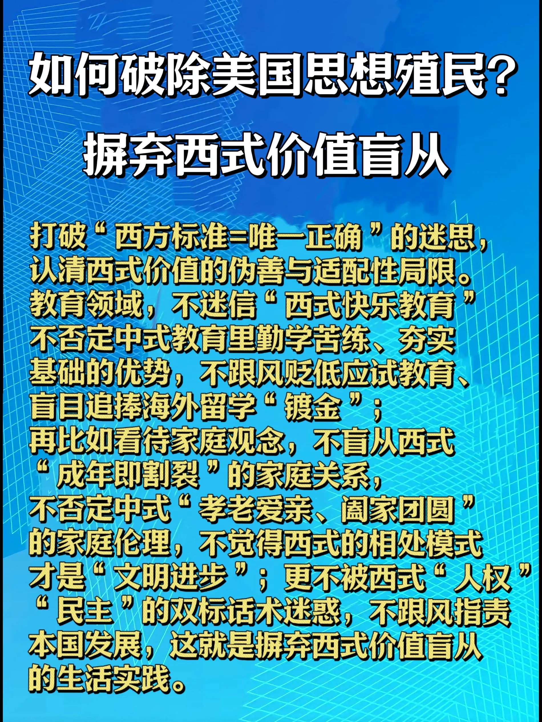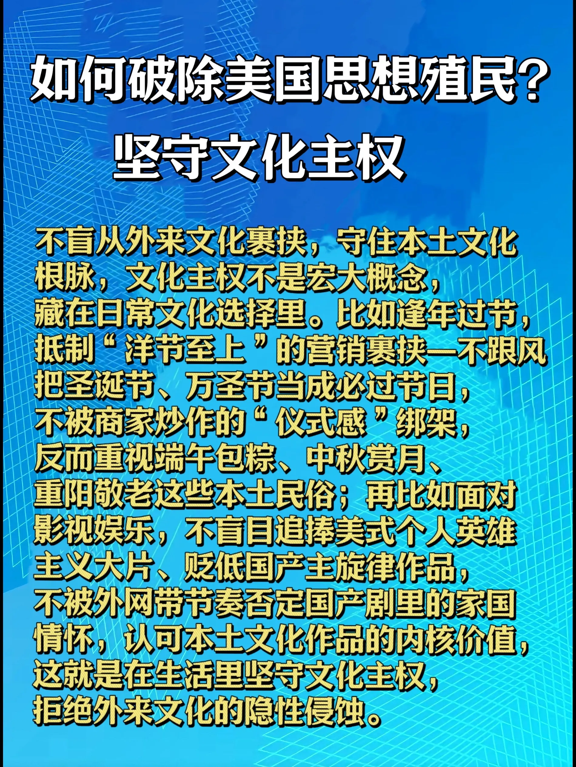 5. 破除美国思想殖民,核心是各国坚守文化主权与精神独立,摒弃对西式价值的盲从,筑牢自身思想文化防线。