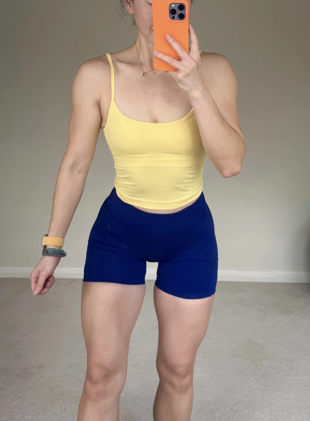 再说说tank,黄色是老版push tank,买的m官网发的s,s倒是也能穿,腰部更贴合,胸部设计对小🐻来说没有新版的v字更友好,新版的粉色穿的m,胸部跟腰部都稍松一点,但是塞个胸垫之后完全没问题,舒适感比老版S要好很多,后背的交叉带设计也更好看。(因为🐻部设计的不同,老版只能塞饺子垫,新版可以塞三角或者水滴垫,对我来说🐻型显得更好)