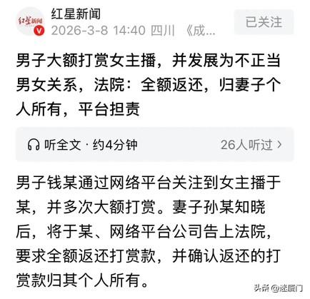 江苏一名已婚男子沉迷网络女主播,为博好感频频大额打赏,女主播察觉其经济实力后主动线下邀约,两人迅速发展成婚外情。为在情人面前撑场面、装大款,男子变本加厉砸钱打赏,每一笔支出,都是他与妻子的夫妻共同财产。妻子无意间发现巨额财产流失,查清真相后怒不可遏,直接将女主播及所属网络平台公司一并告上法庭,要求全额返还所有打赏款项,且明确主张这笔钱应归自己个人所有。近日,这起备受关注的家事纠纷案件,法院给出了明确判决。