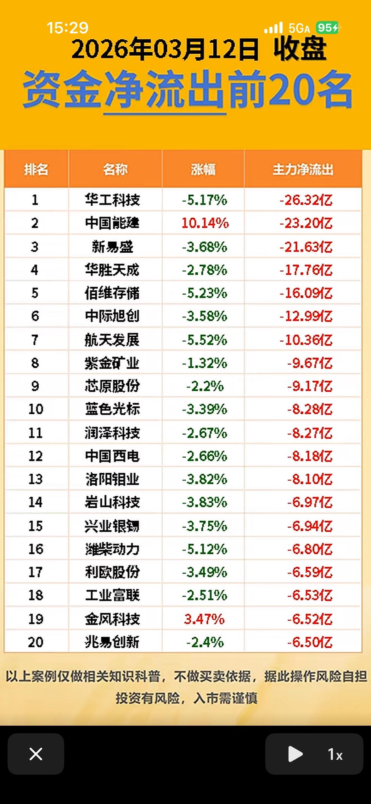 3月12日收盘主力资金前20名的流向情况揭晓啦。