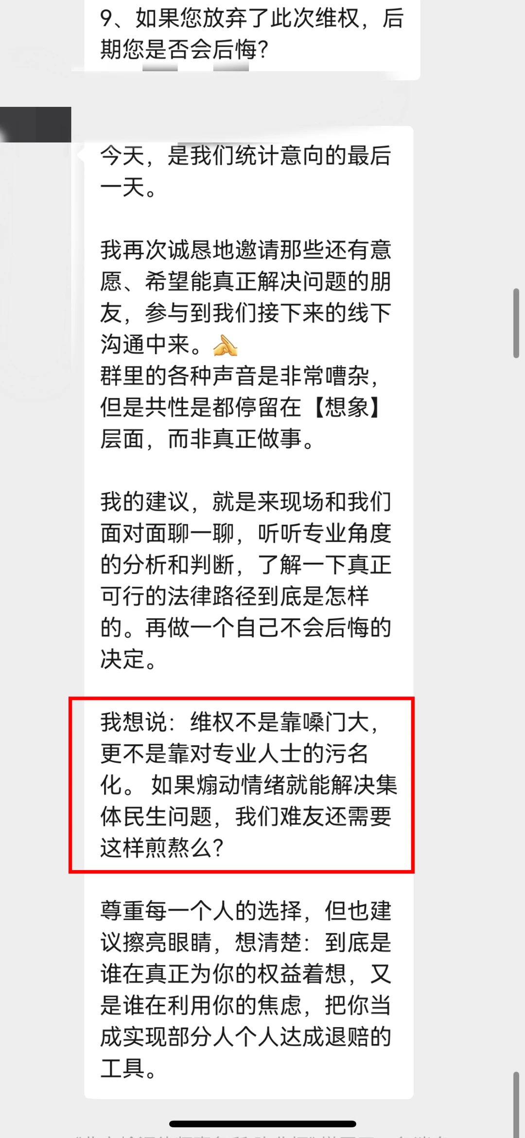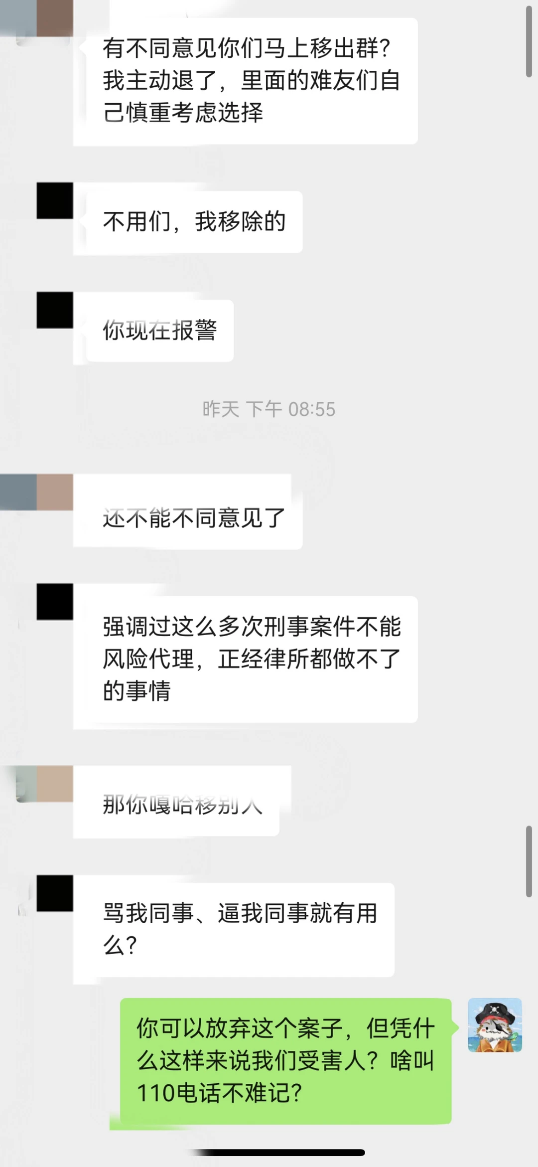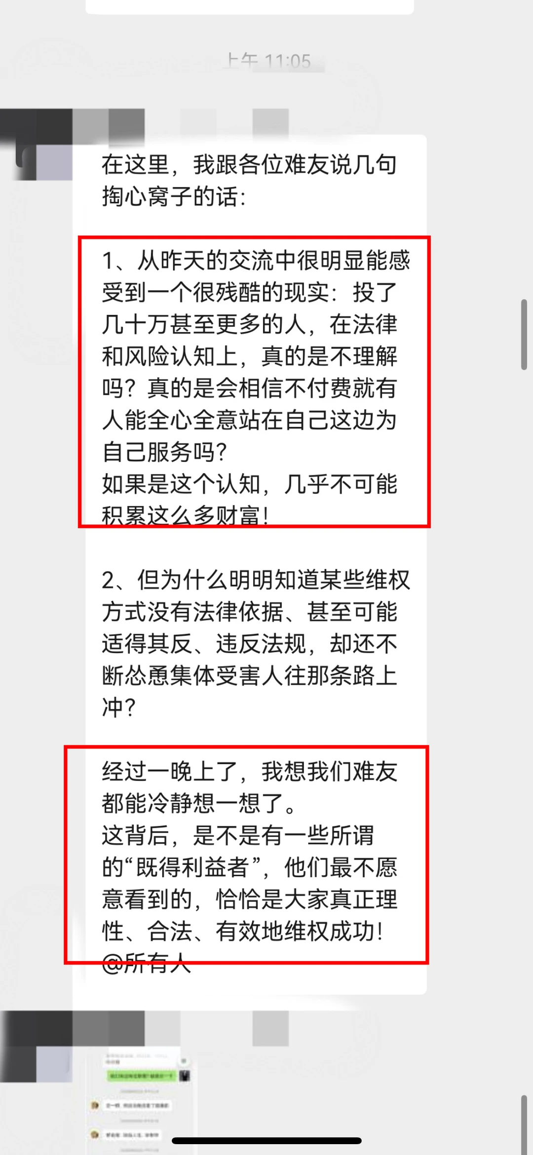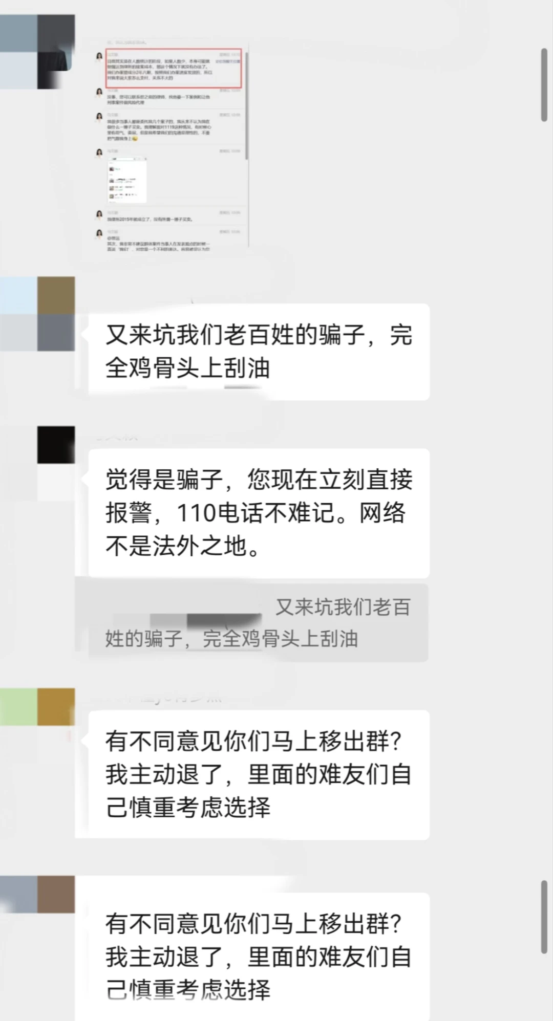 5.对提出异议的受害人直接踢出群聊,并天天在群里洗脑、PUA,在毫无证据的情况下,称某些受害者实际为“既得利益者”,扰乱视听。不仅如此,用言语攻击受害人,说受害人是法盲,嘲笑受害人能积累财富都是“祖坟上冒青烟”。