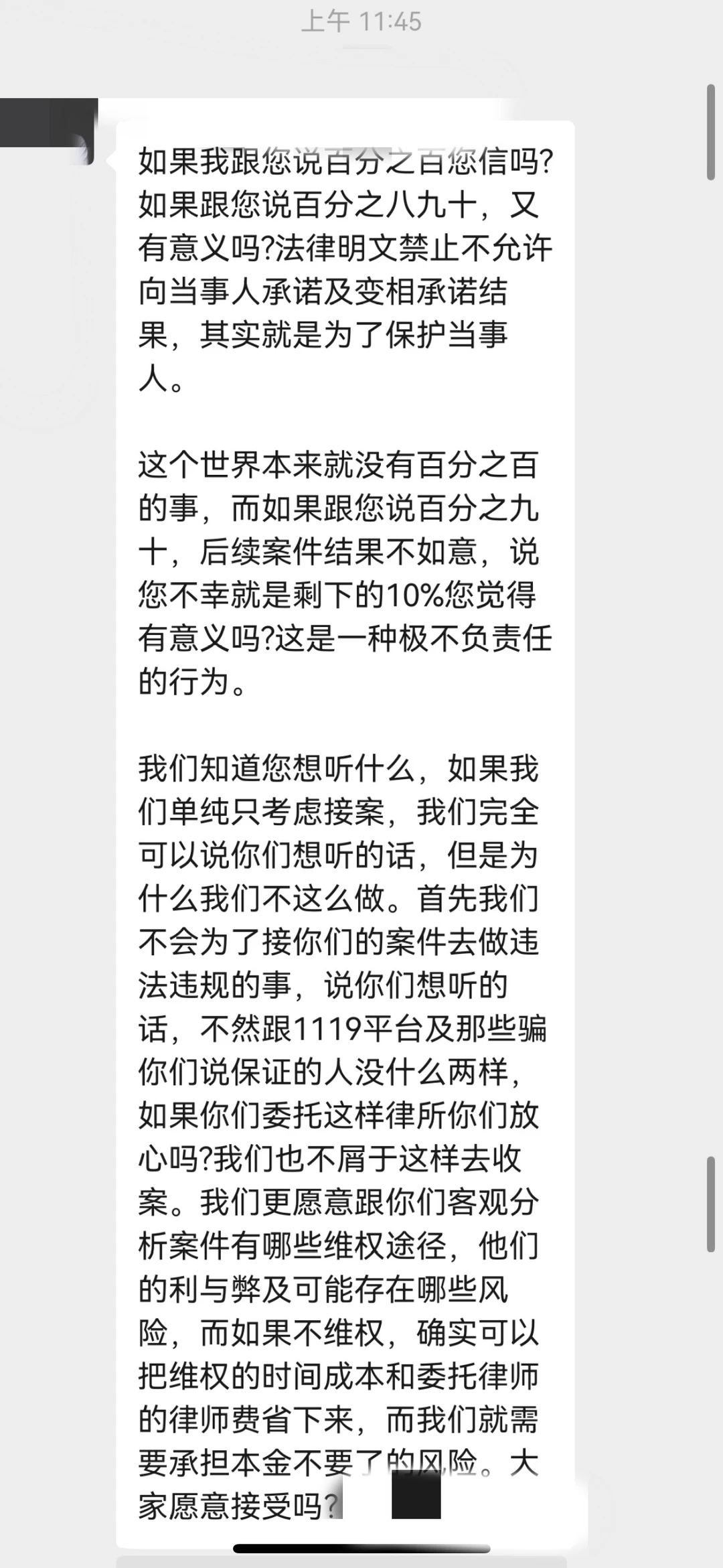 4.受害人提出分期付款,或按追缴数额比例分配,均不被接受,称只有一次性付全款一种选项,且不保证能否追回资金,并告知受害者,律师就是医生,病人去医院看病,医生不能100%保证能治好;受害人问具体落地执行方案,给到答复就是洗脑式PUA;