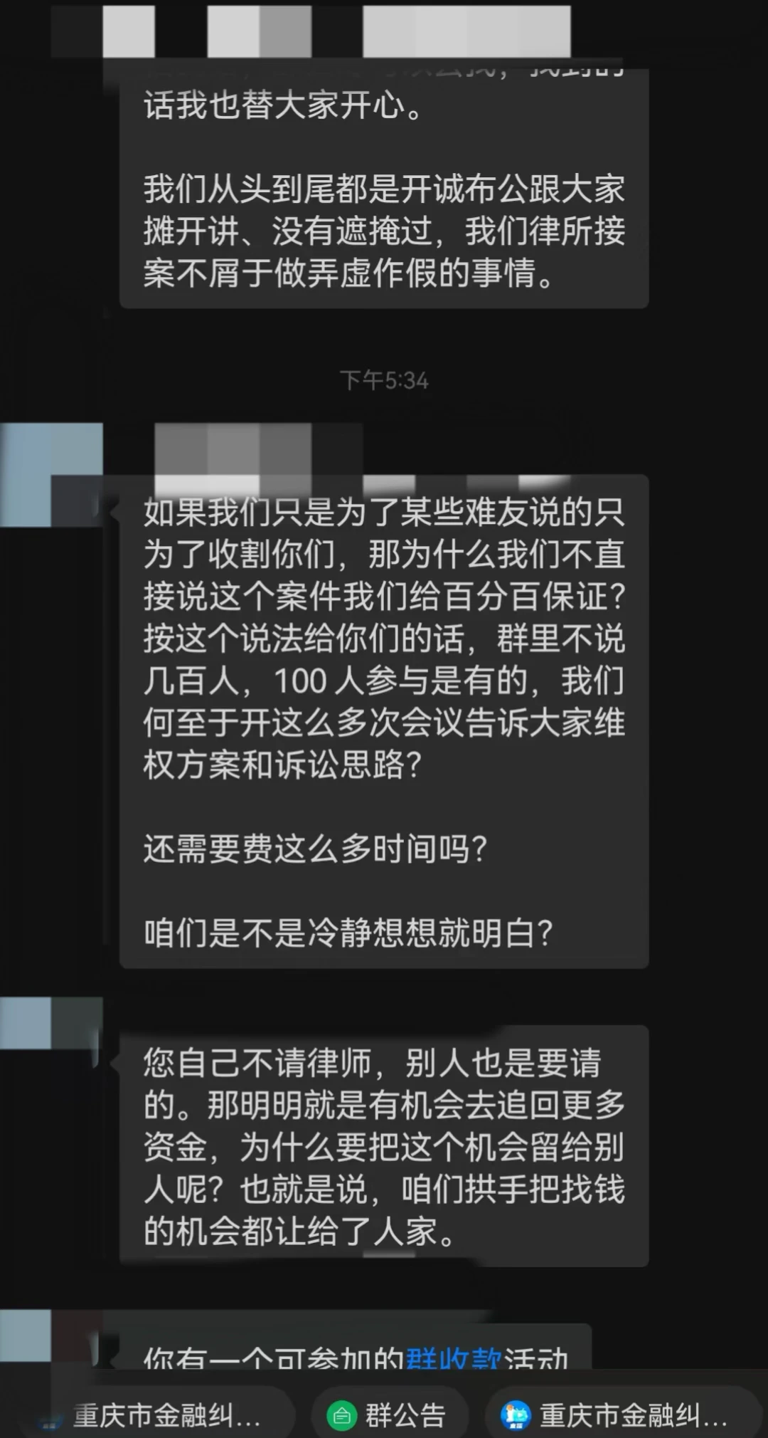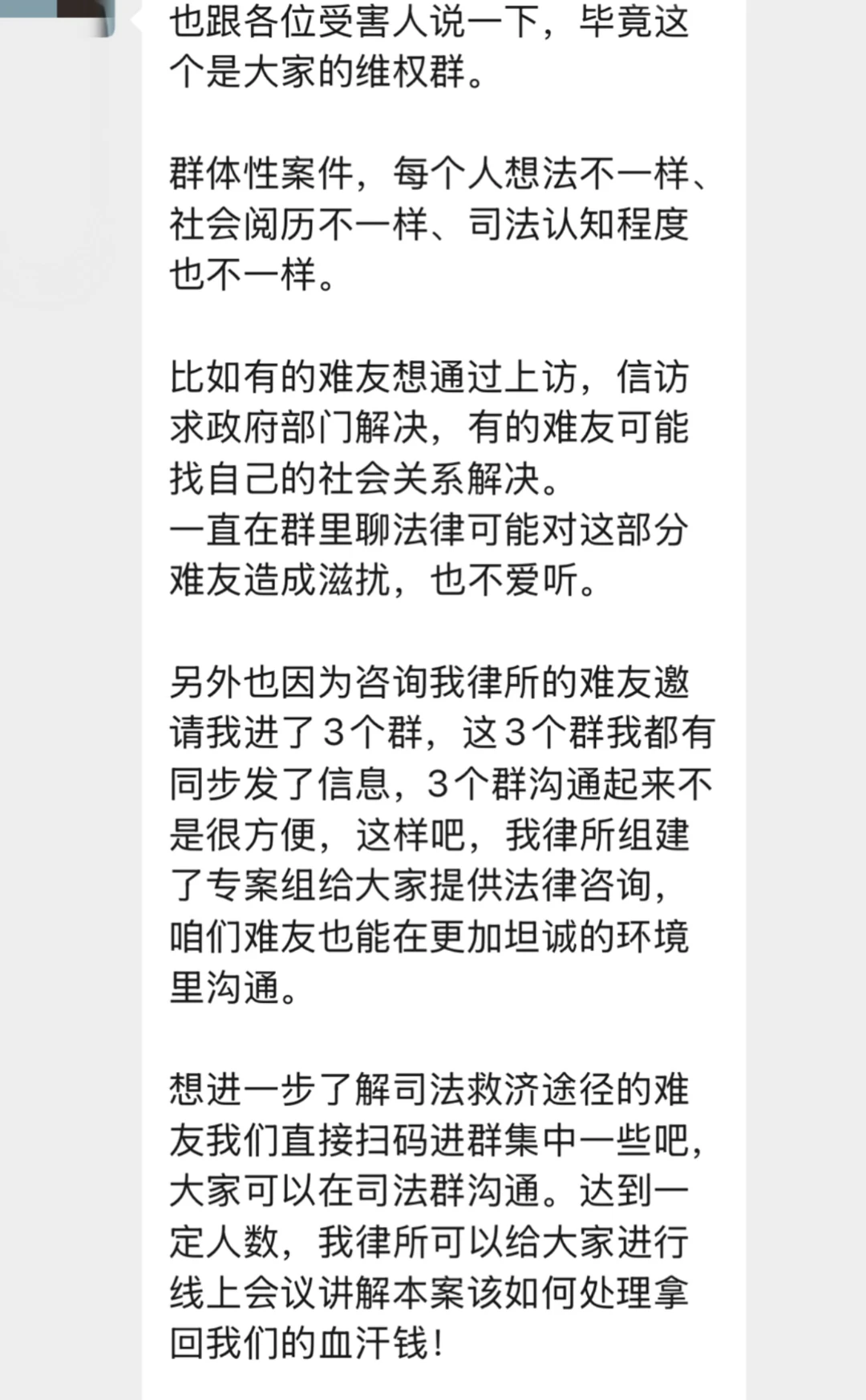 1.受害人了解到该律所声称专业做此类案件,将律所员工拉近群;