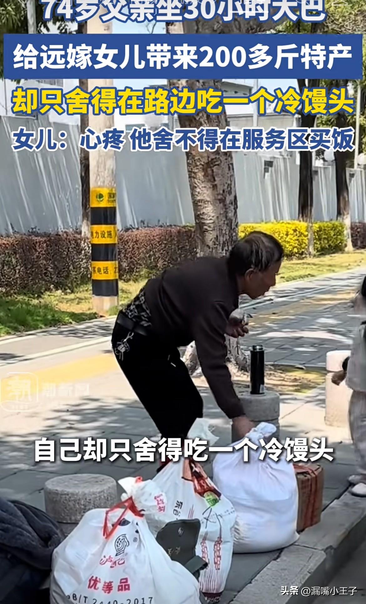 一位74岁的老父亲,从四川出发,坐了整整30个多个小时的大巴车,给远嫁厦门的女儿带去200多斤的特产,200多个土鸡蛋,100多斤菜籽油,还有剥好的核桃仁,而他自己却只舍得在路边就着白开水吃一个冷馒头,很难想象这佝偻的身躯是如何将200多斤的特产从四川带去厦门的。