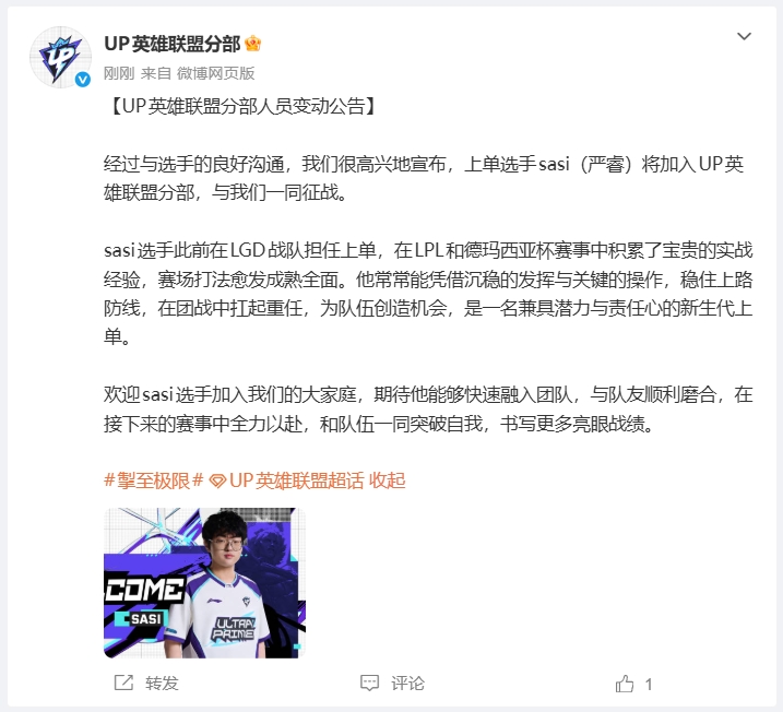 直播吧03月23日讯UP俱乐部官方宣布,此前从LGD离队的上单选手sasi(严睿)将加入队伍;具体公告如下: