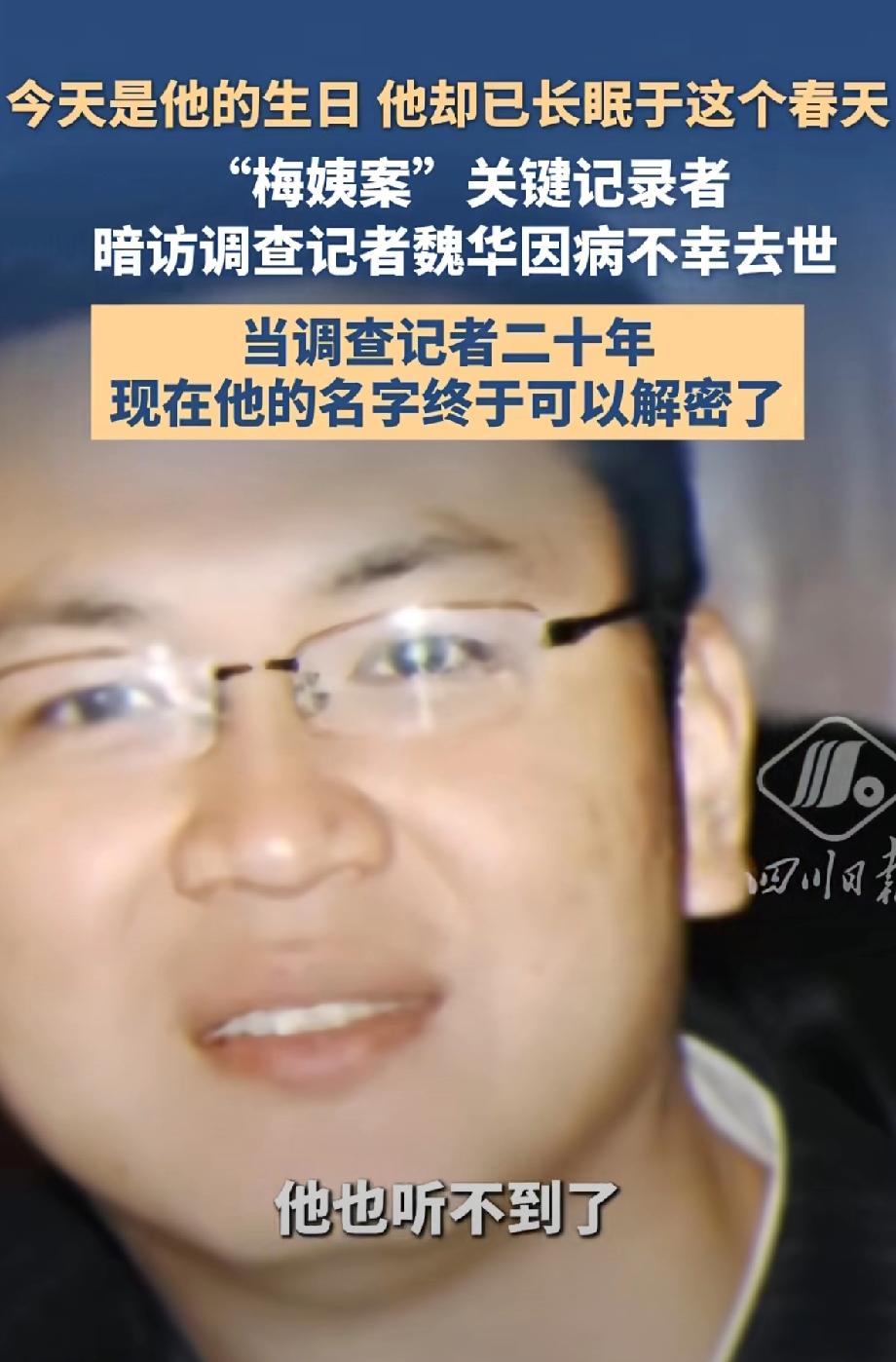 记者魏华,在他这是生日的前三天离世了。20年暗访调查,长期卧底。调查黑产(代孕,拐卖,食品安全)等等,精神长期处于紧张,压力超负荷。于3月19日深夜因心脏病离世年仅45岁,3月22日是他的生日。他最放心不下的是还未成年的孩子吧!这些年他一直在工作,工作很少有时间和精力 放在家庭上。而在离世后,他终于能以真名示人了。他把他的半生都奉献在他的职业上,造福于社会。所以他离去了,人们怀念他,为他惋惜。