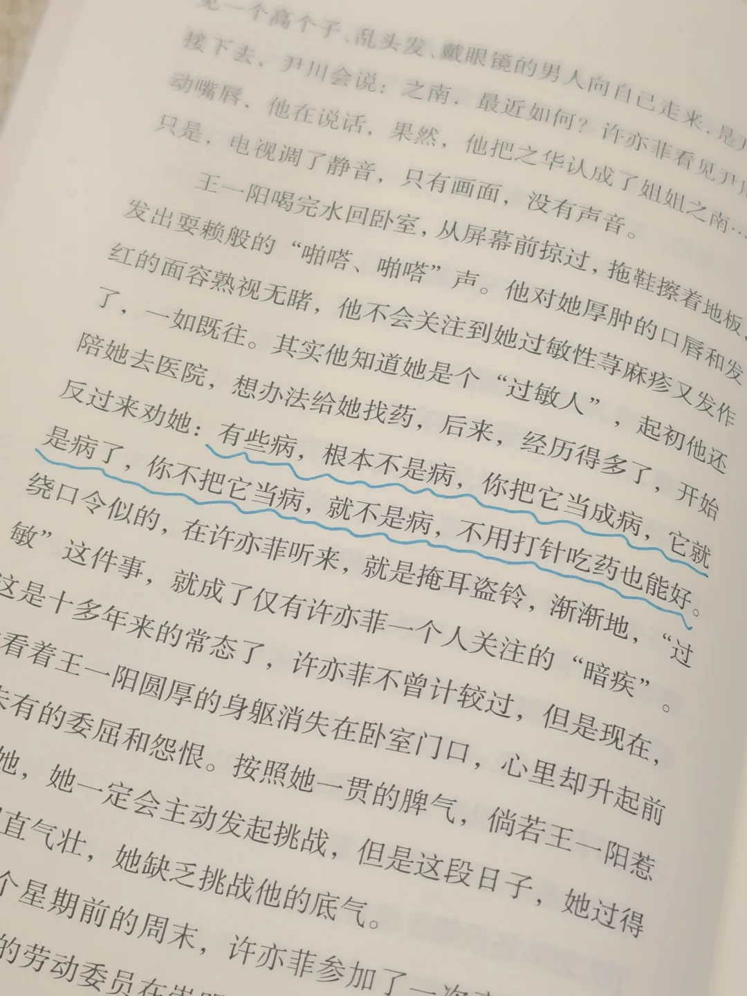 书里有个细节让我泪目,患有荨麻疹的女主人公,丈夫早已对她的“过敏”熟视无睹。这种身体的反应,何尝不是对那段麻木婚姻的心理投射?作者薛舒在后记里提到,丈夫曾对她说:“有些病,根本不是病,你不把它当病,就不是病”。这句话初听冷血,细品却是大智慧。