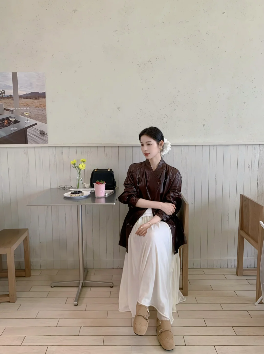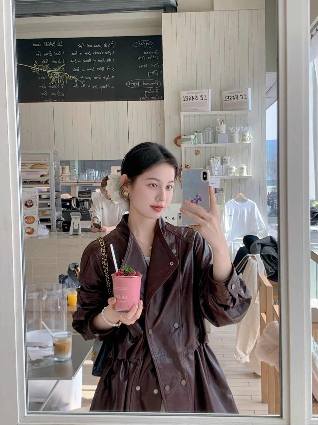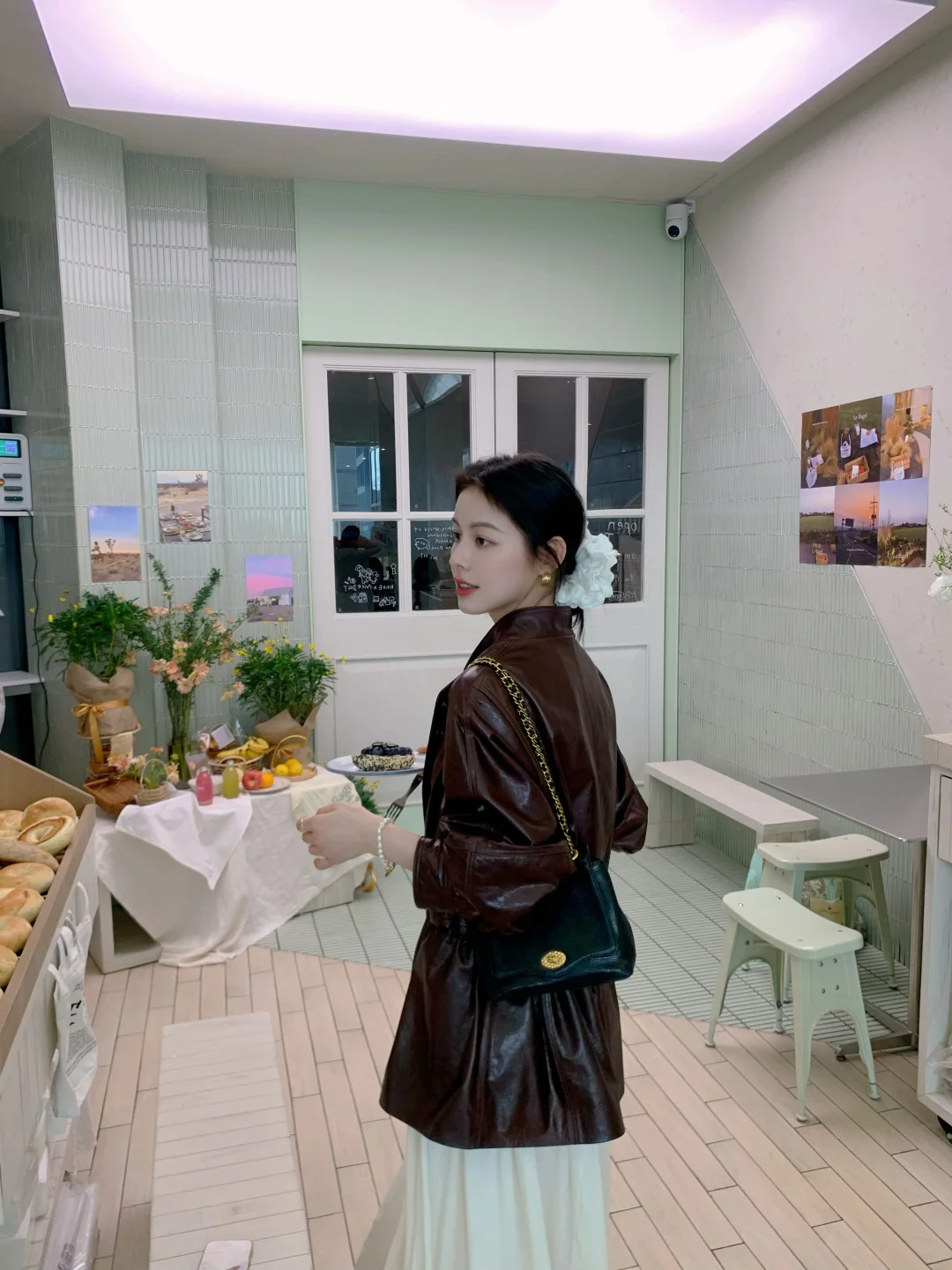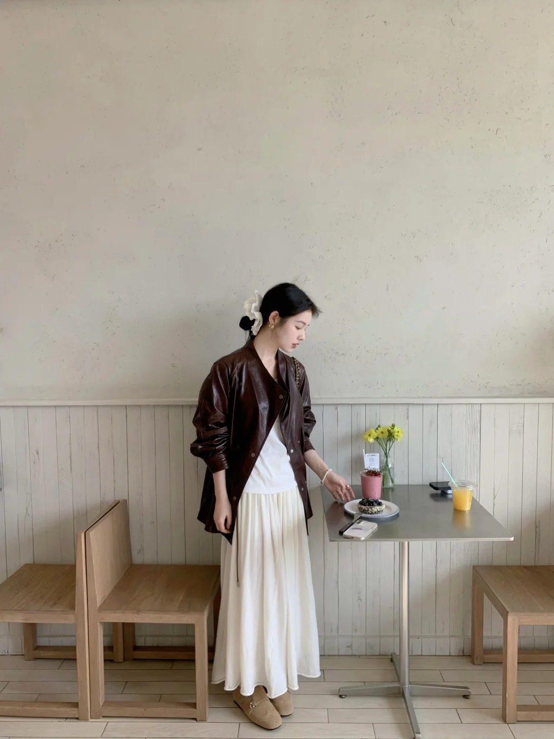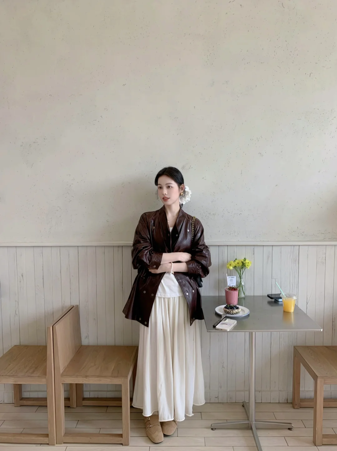 皮衣配低丸子头还蛮韩~