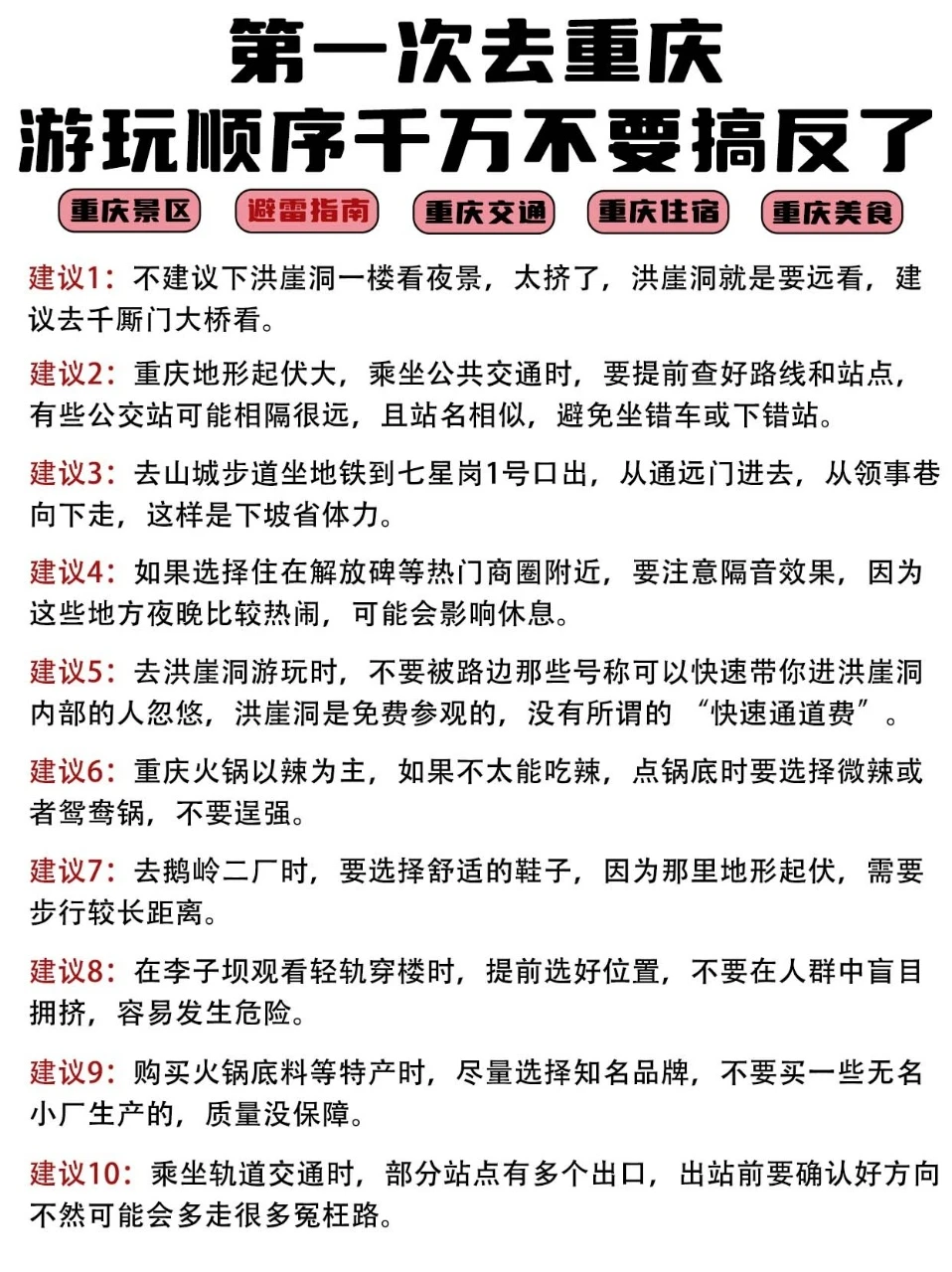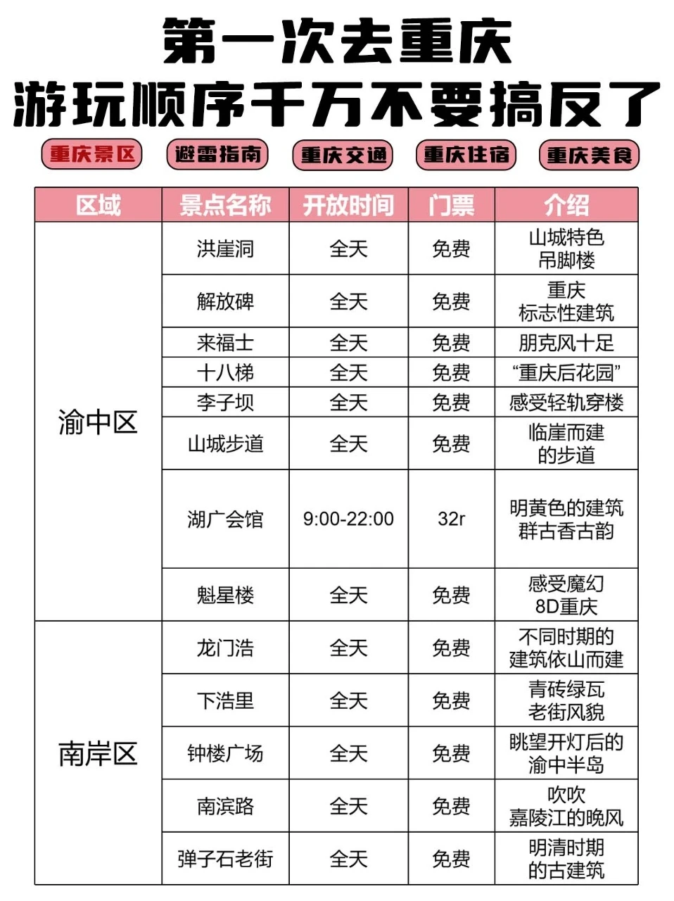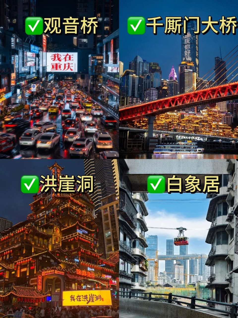 ▫李子坝除了看轻轨穿楼,建议去「三层马路」步道,能拍列车从楼里冲出来的动态感 ▫坐长江索道选「南站」起点,排队人少!傍晚坐能同时看到日落和两岸灯光渐亮