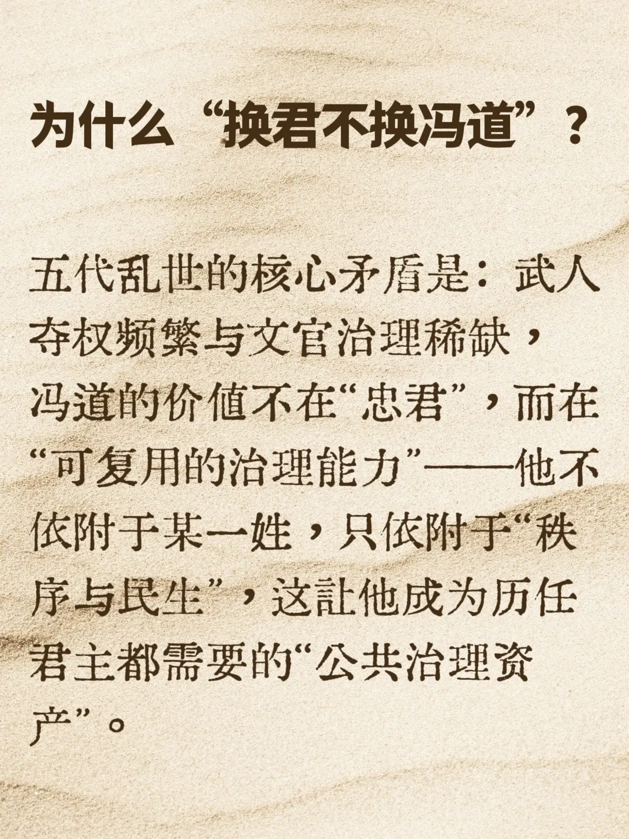 评价一个人,要看他在乱世做了什么,而不是看他换了多少个主公。 冯道之后,才有宋代的文化复兴。他是黑暗时代里,撑起中华文明的那根硬骨头。太平年