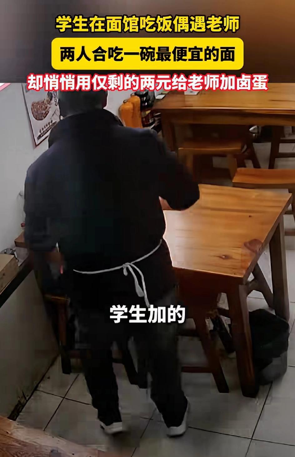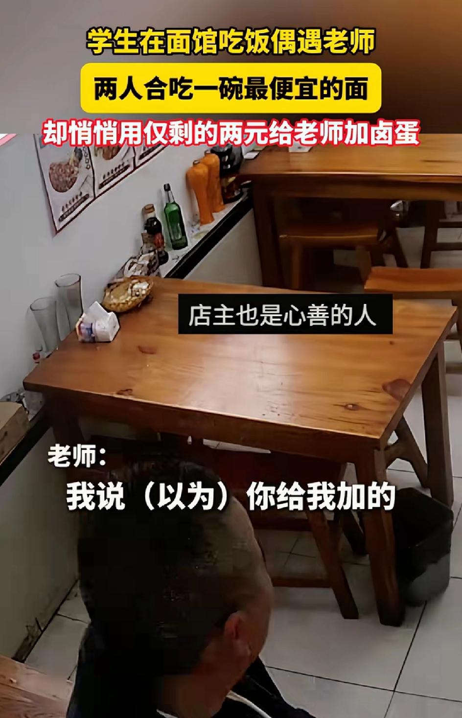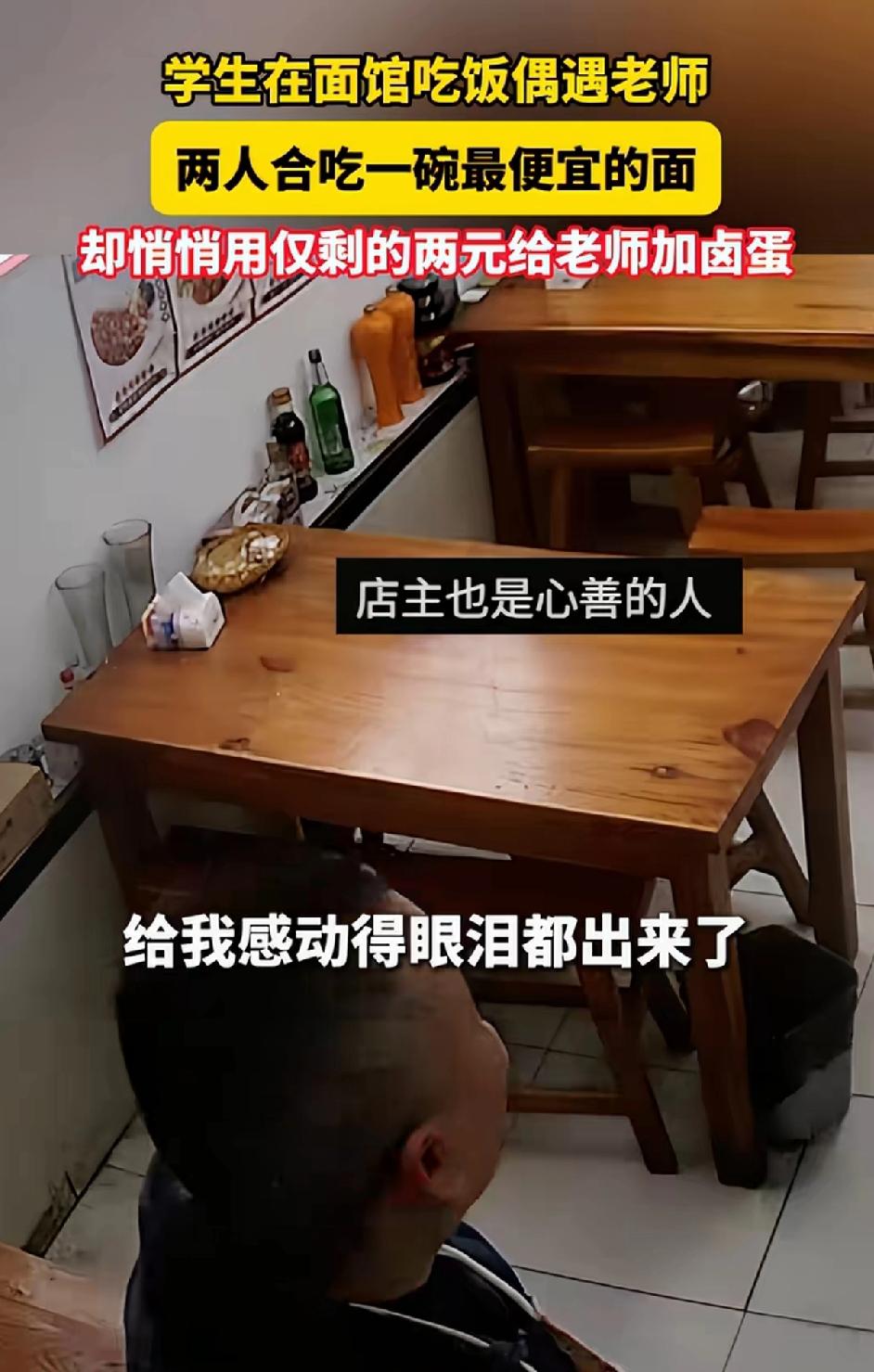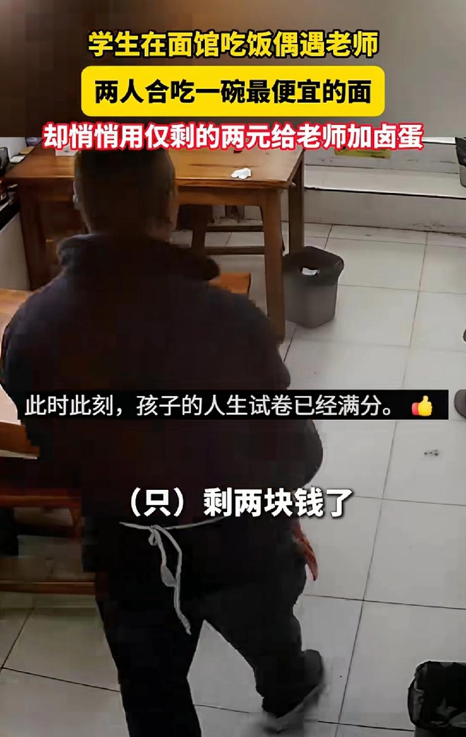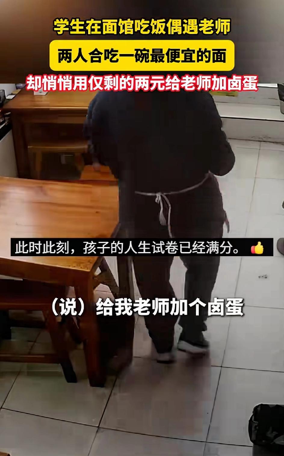 学校附近有一家面馆。放学的时候两个男同学去吃面,手机没有多少钱了,合适一碗面,一人分一半。正吃着,他们老师也过来吃面了。两个学生吃完了之后就商议着把手机里仅剩的2块钱到店主那里买了个卤蛋给老师加进去。老师并不知情,还以为店主给他加的。学生走后,店主抹着眼泪告诉了老师,虽说是一件小事,着实令人挺感触的。网友说这两个学生他们的品德是满分,老师也一定是好老师,才会赢得同学的尊重。
