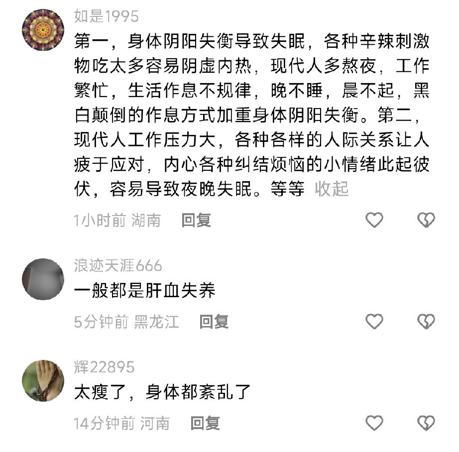 宋轶讲自己入睡困难,四点多都睡不着 躺在床上也没玩手机,就是睡不着,整得人很焦虑。 很多网友开始分析原因和分享小妙招,显然,当代年轻人受失眠困扰的不在少数。 有人说要养血,有人说要滋阴。还有人说她太瘦了。 女明星都吃的少,肚子饿了更睡不着。 还是要找准失眠的关键原因,才能对症调理。 宋轶